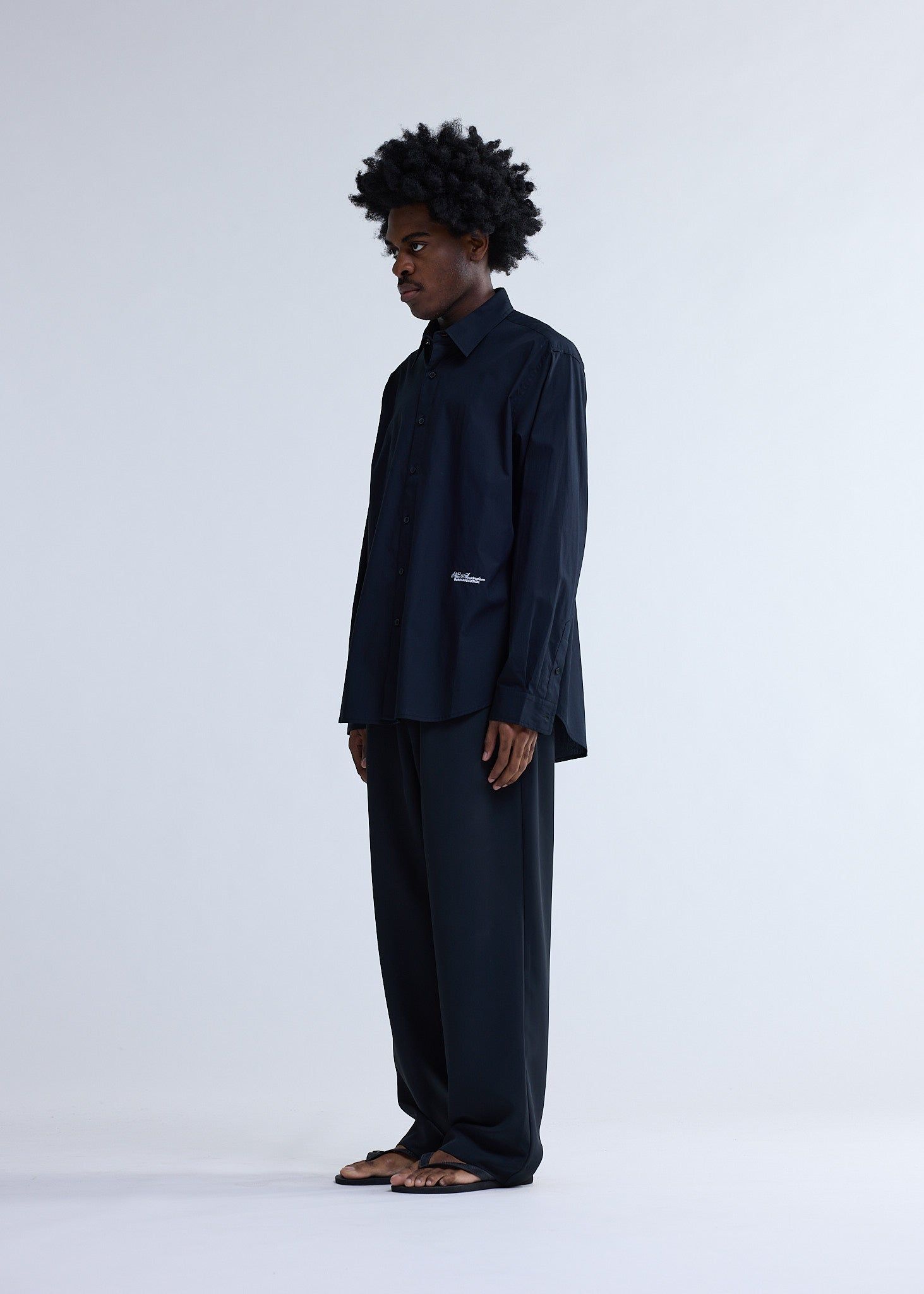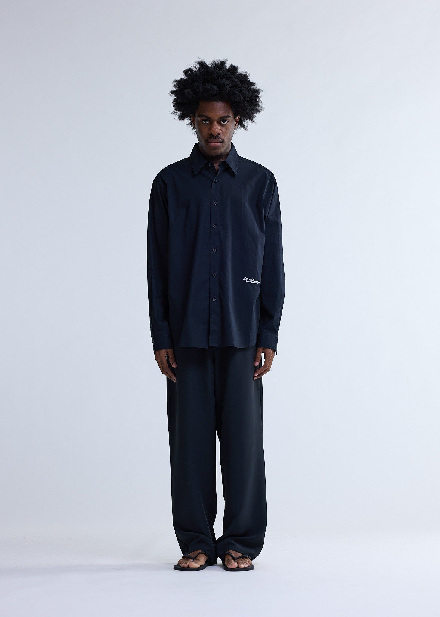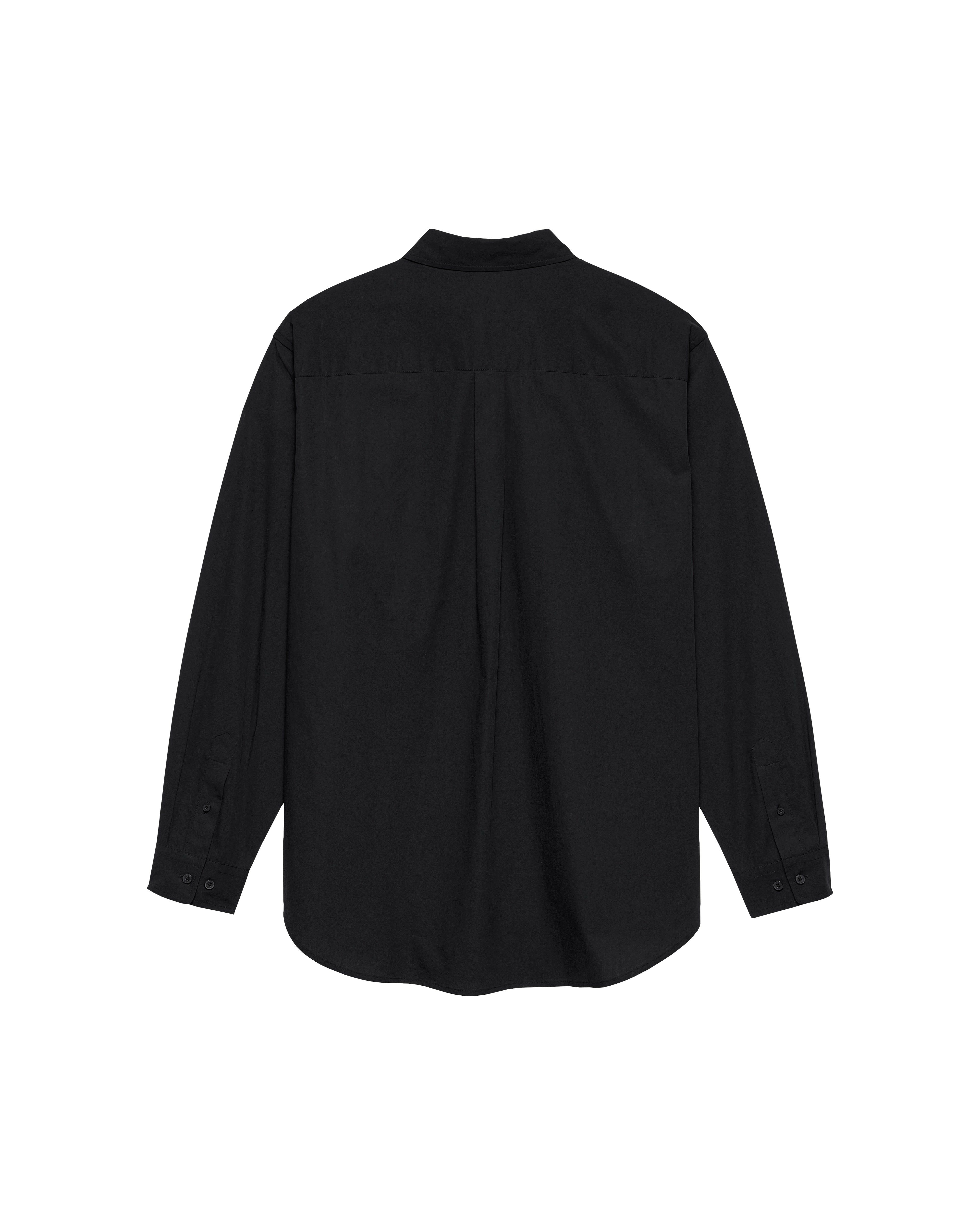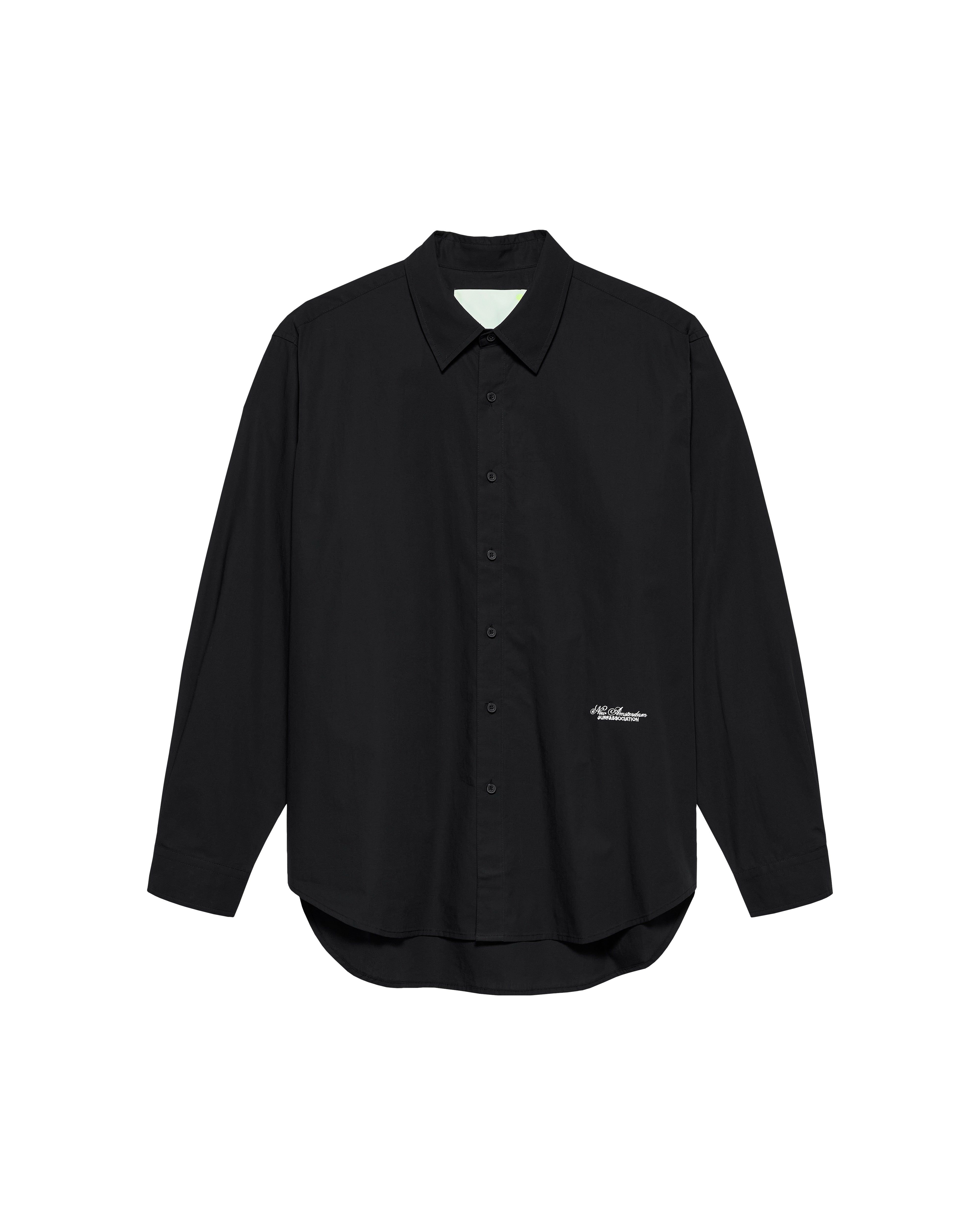 Low stockButton-up shirt crafted from lightweight cotton poplin in black, with a small contrast New Amsterdam text logo embroidered on the front. Cut for a regular fit with a hip-length silhouette.