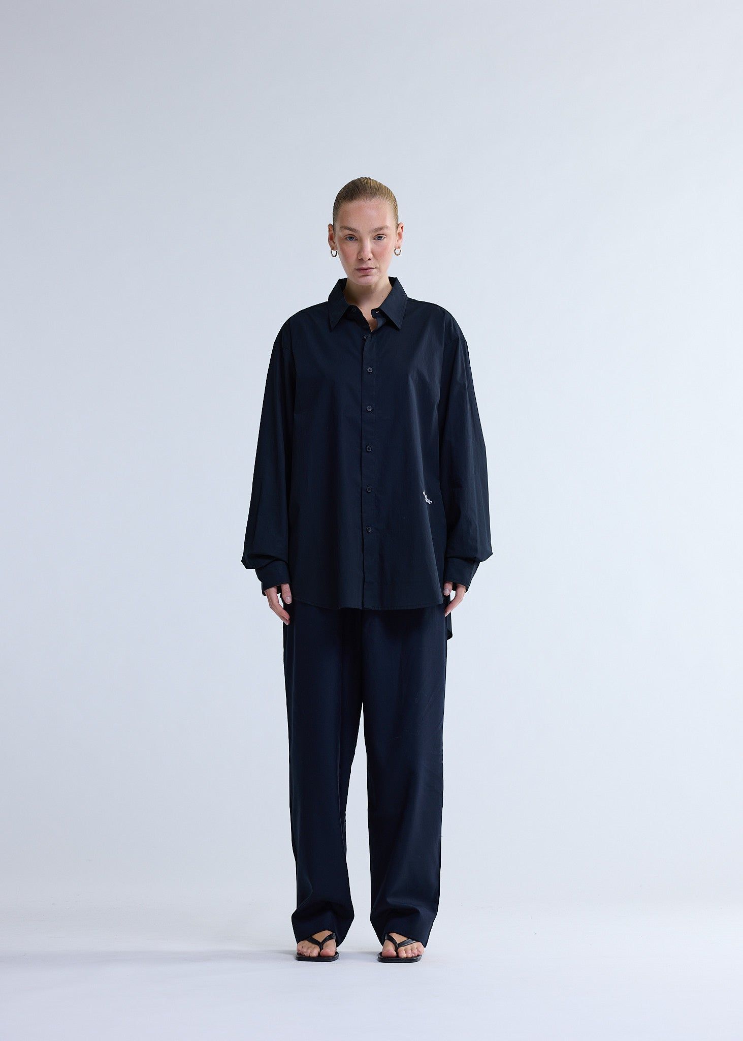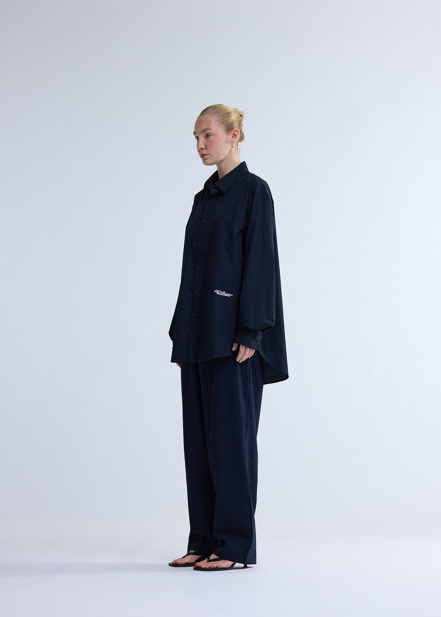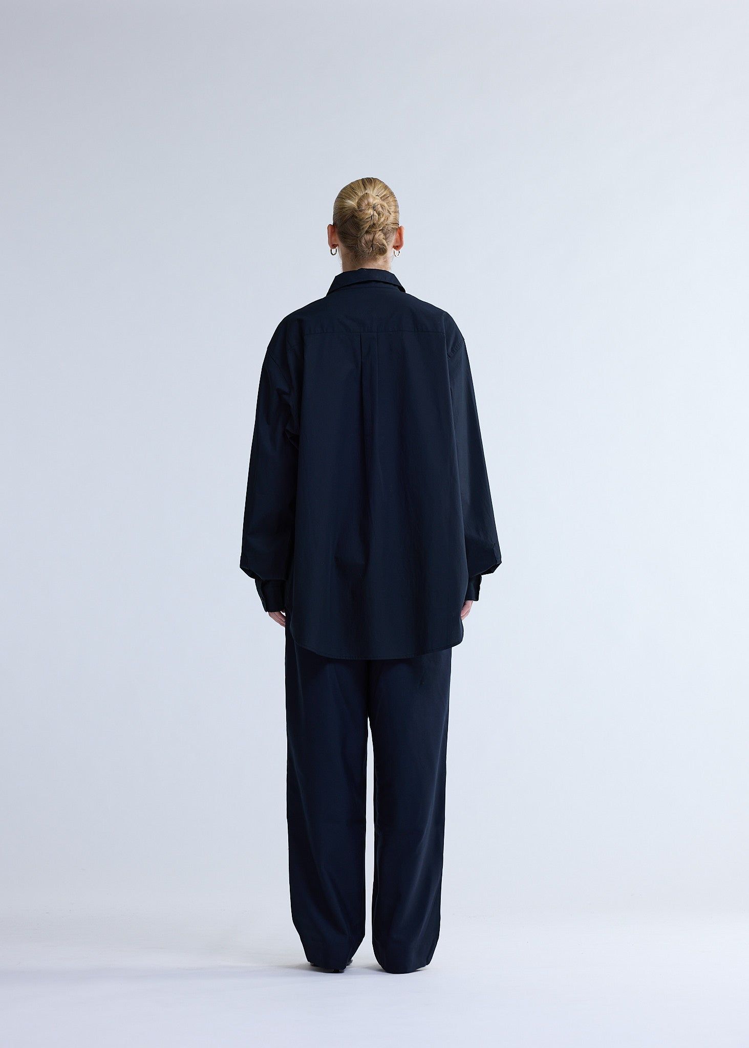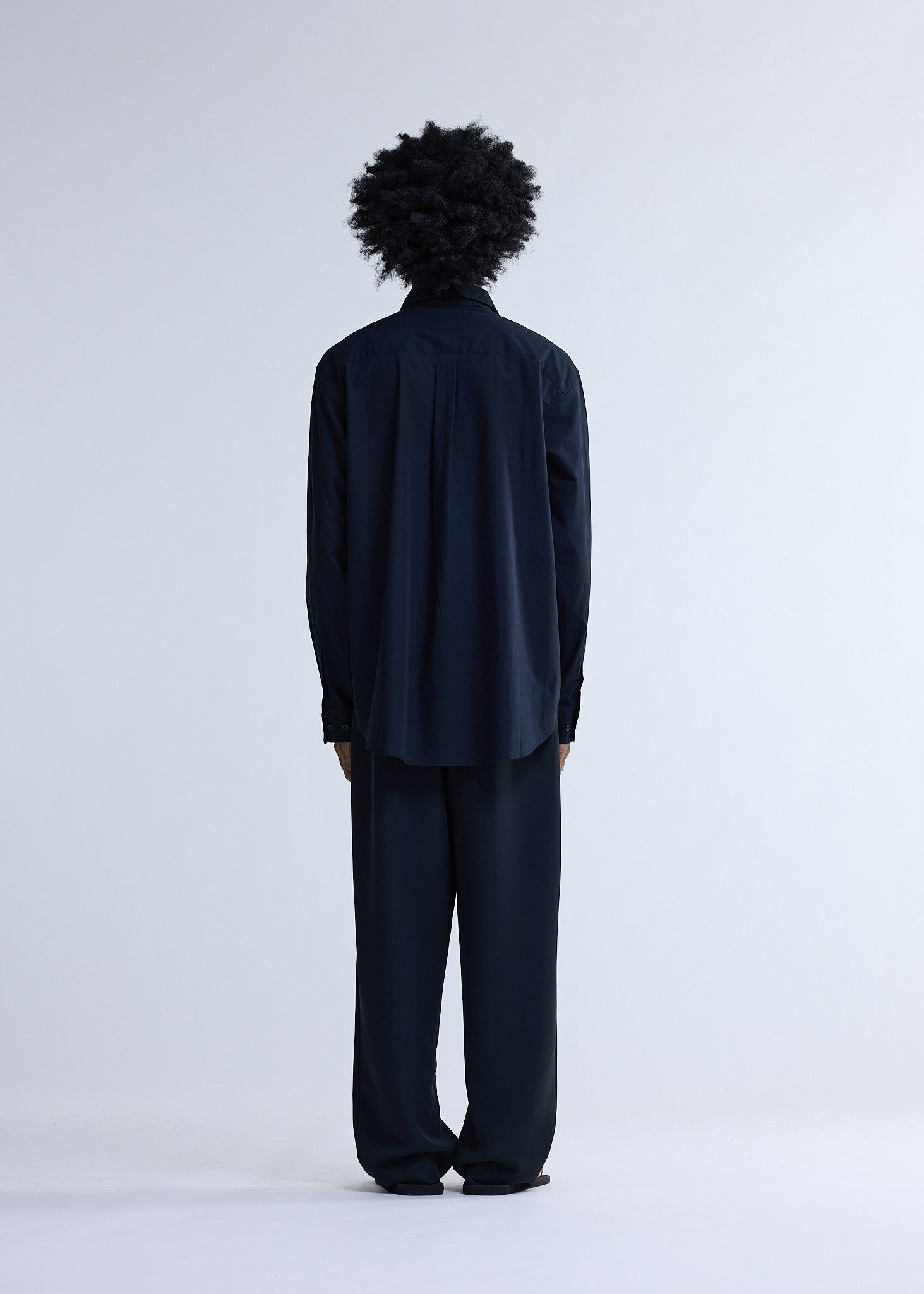 Low stockButton-up shirt crafted from lightweight cotton poplin in black, with a small contrast New Amsterdam text logo embroidered on the front. Cut for a regular fit with a hip-length silhouette.