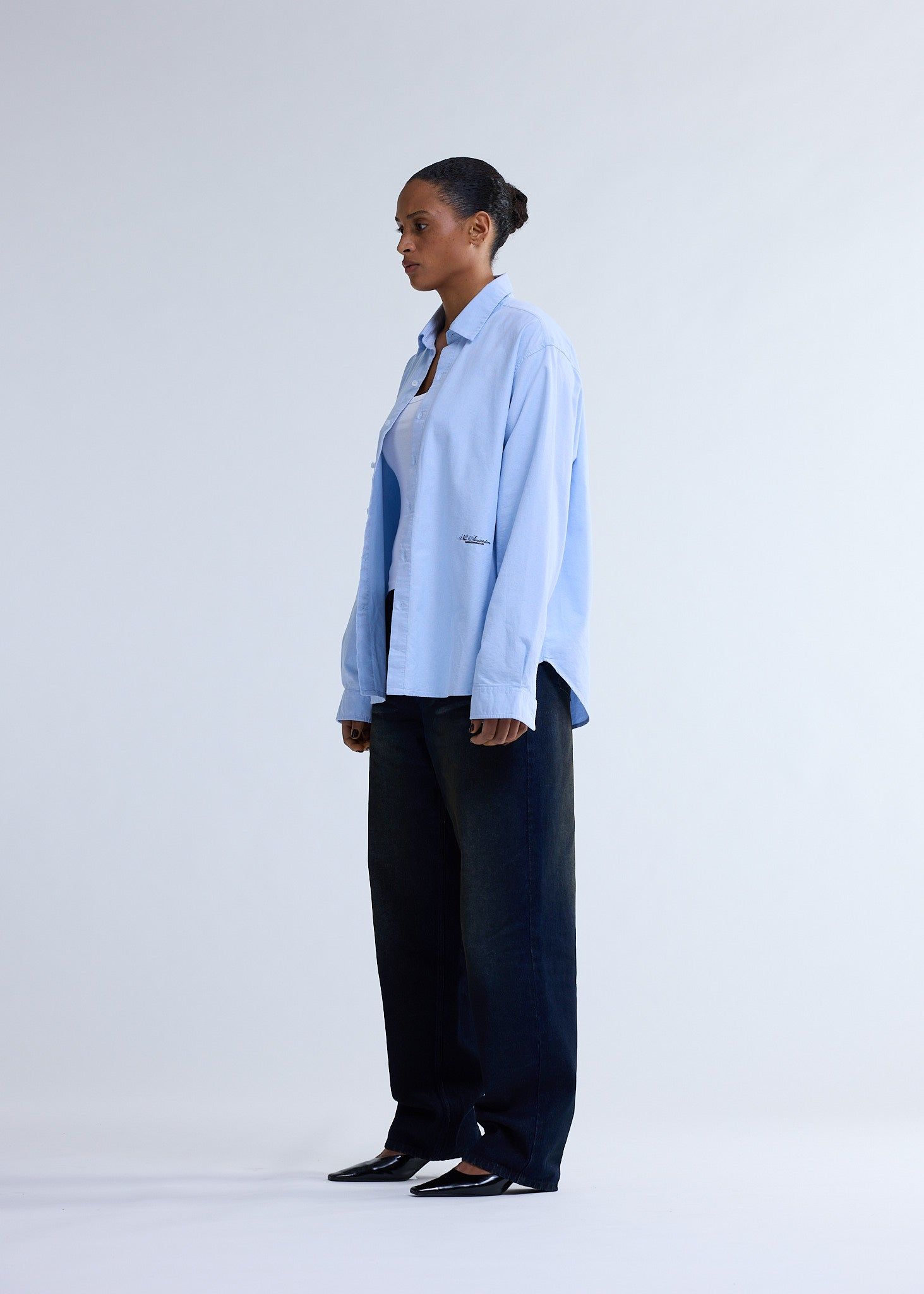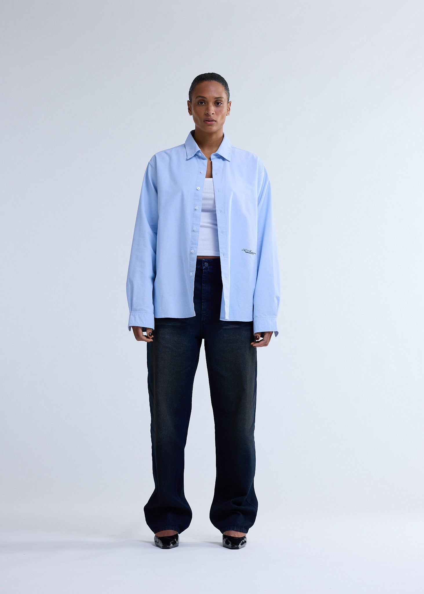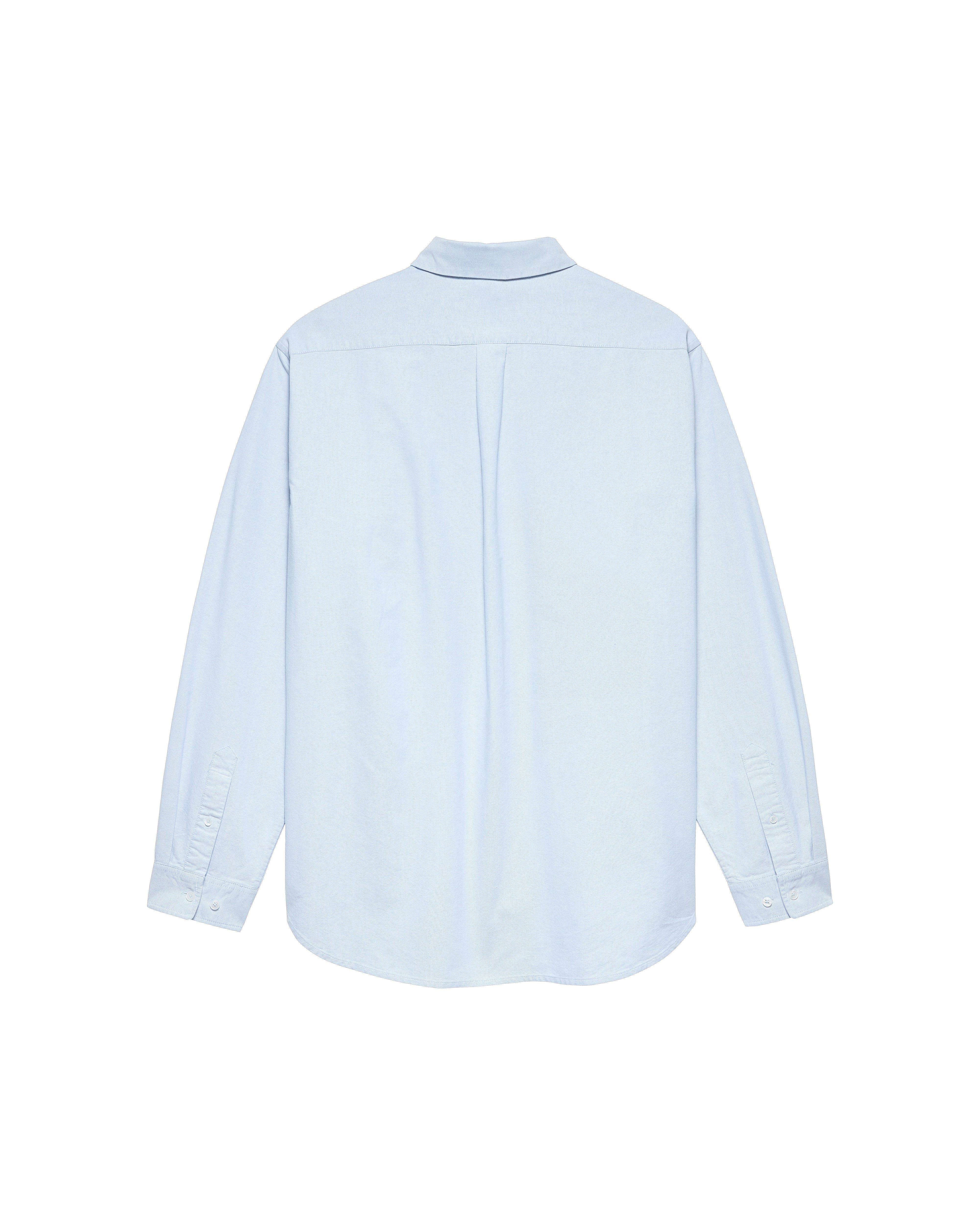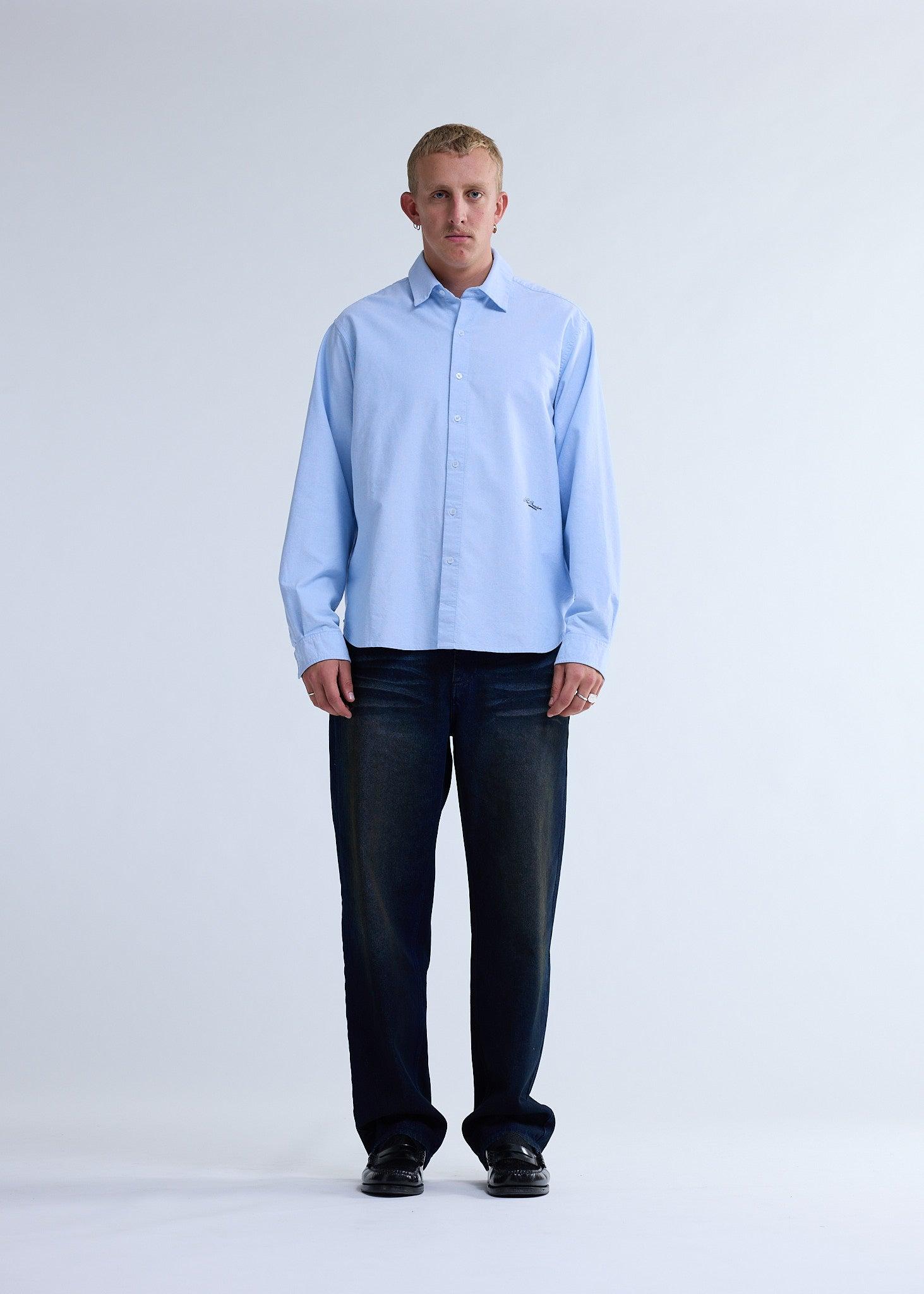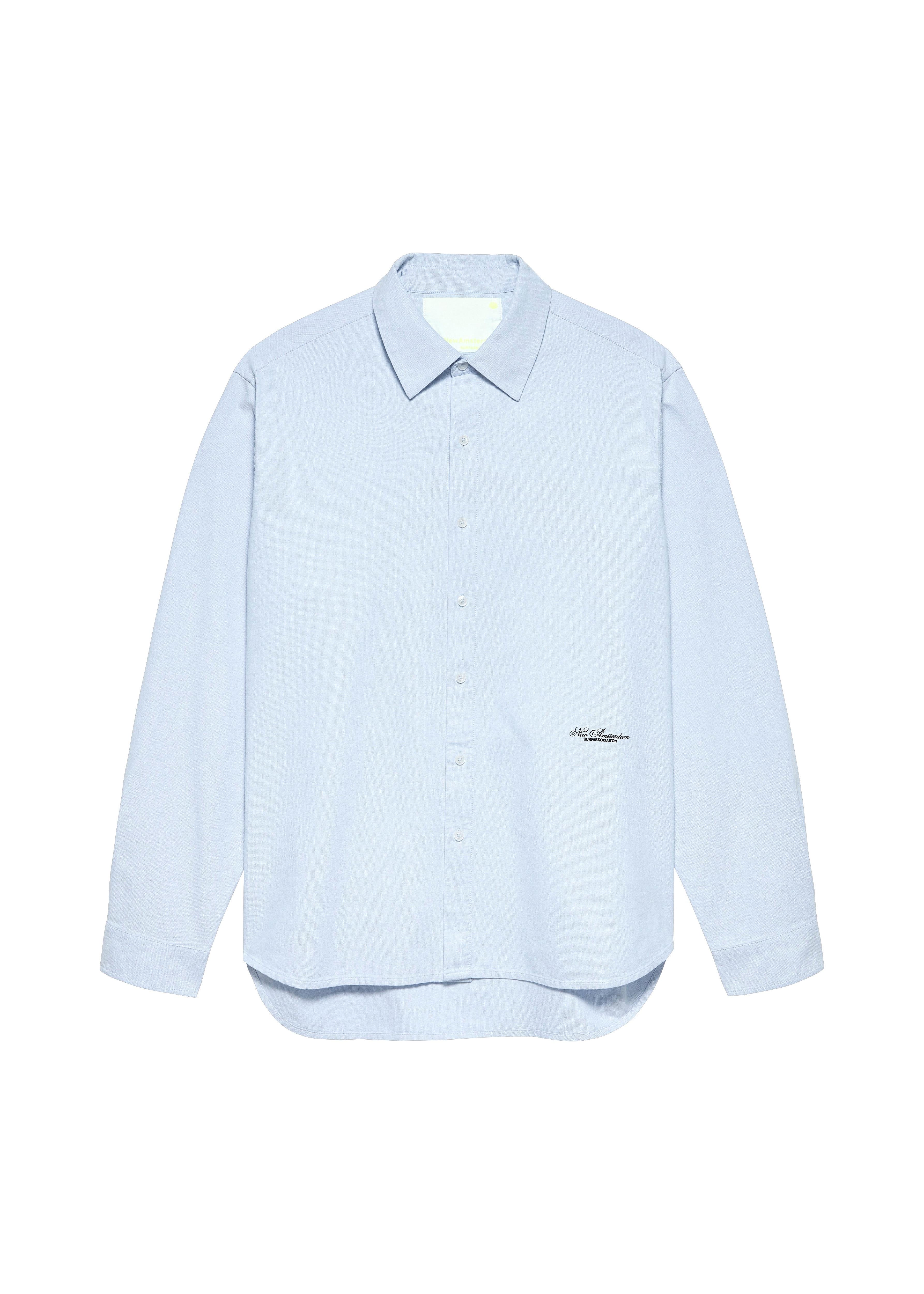 Low stockThis button-up shirt is crafted from 100% oxford cotton in a soft light blue. It features a small New Amsterdam text logo embroidered on the front and is cut for a relaxed unisex fit with a hip-length silhouette.