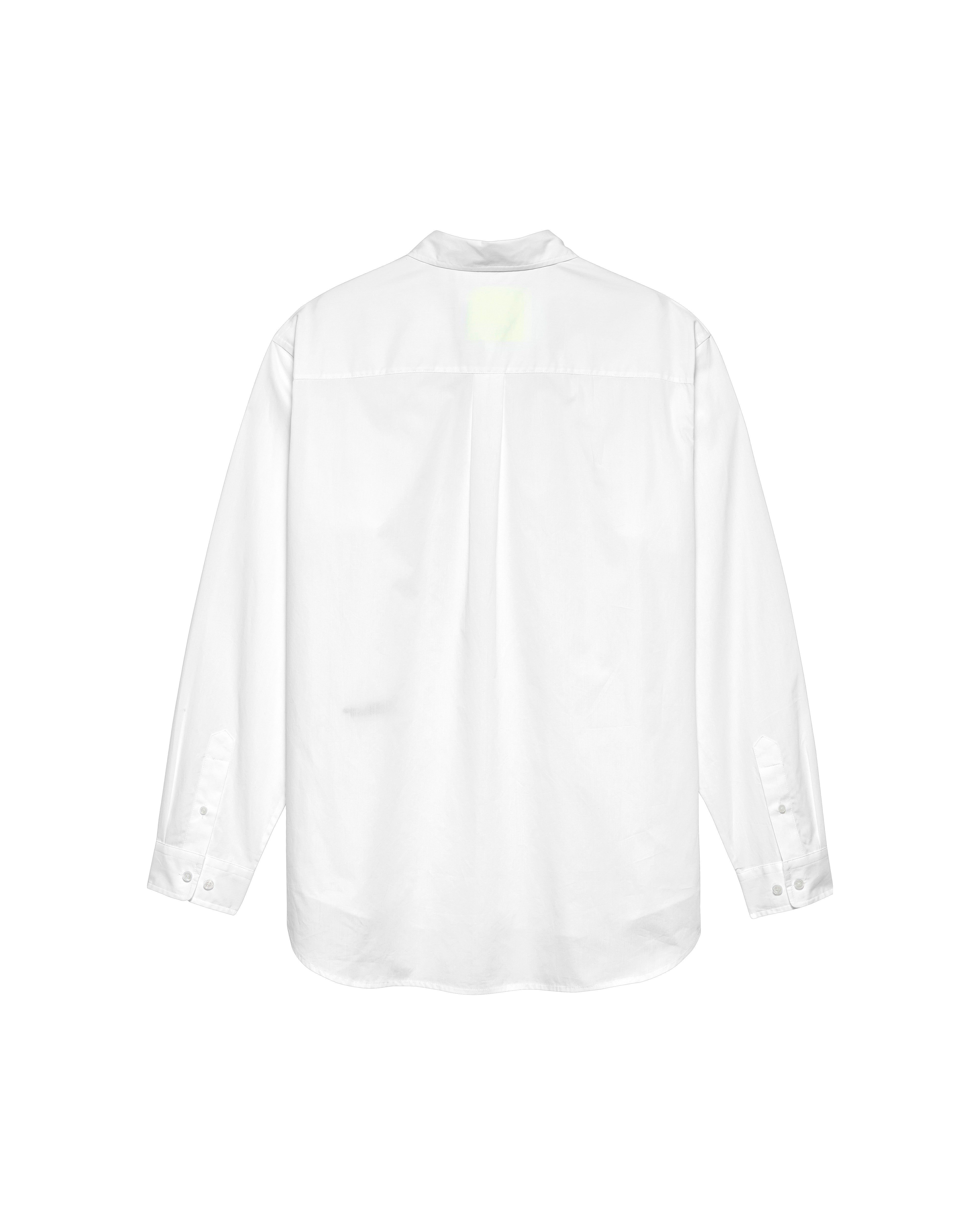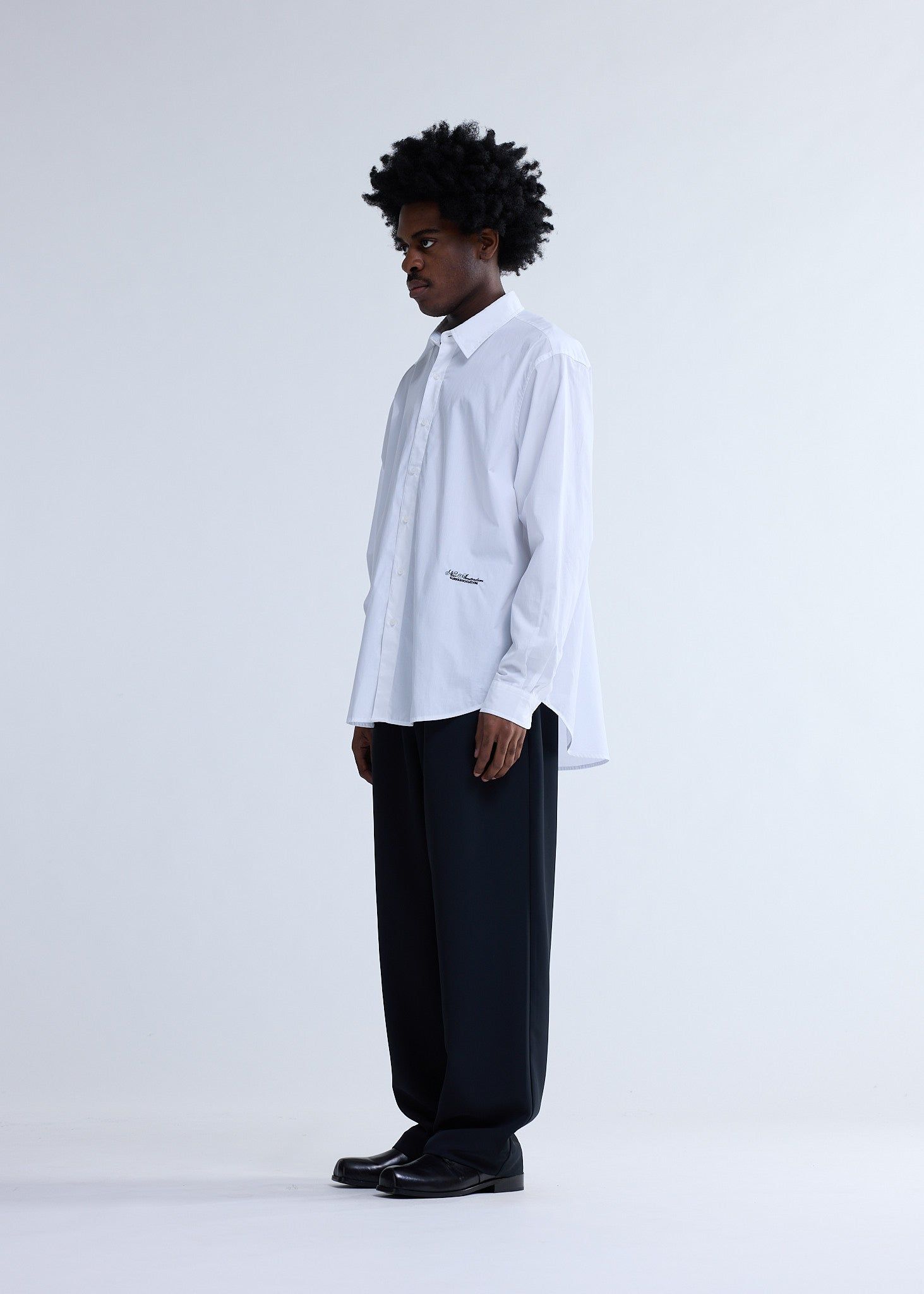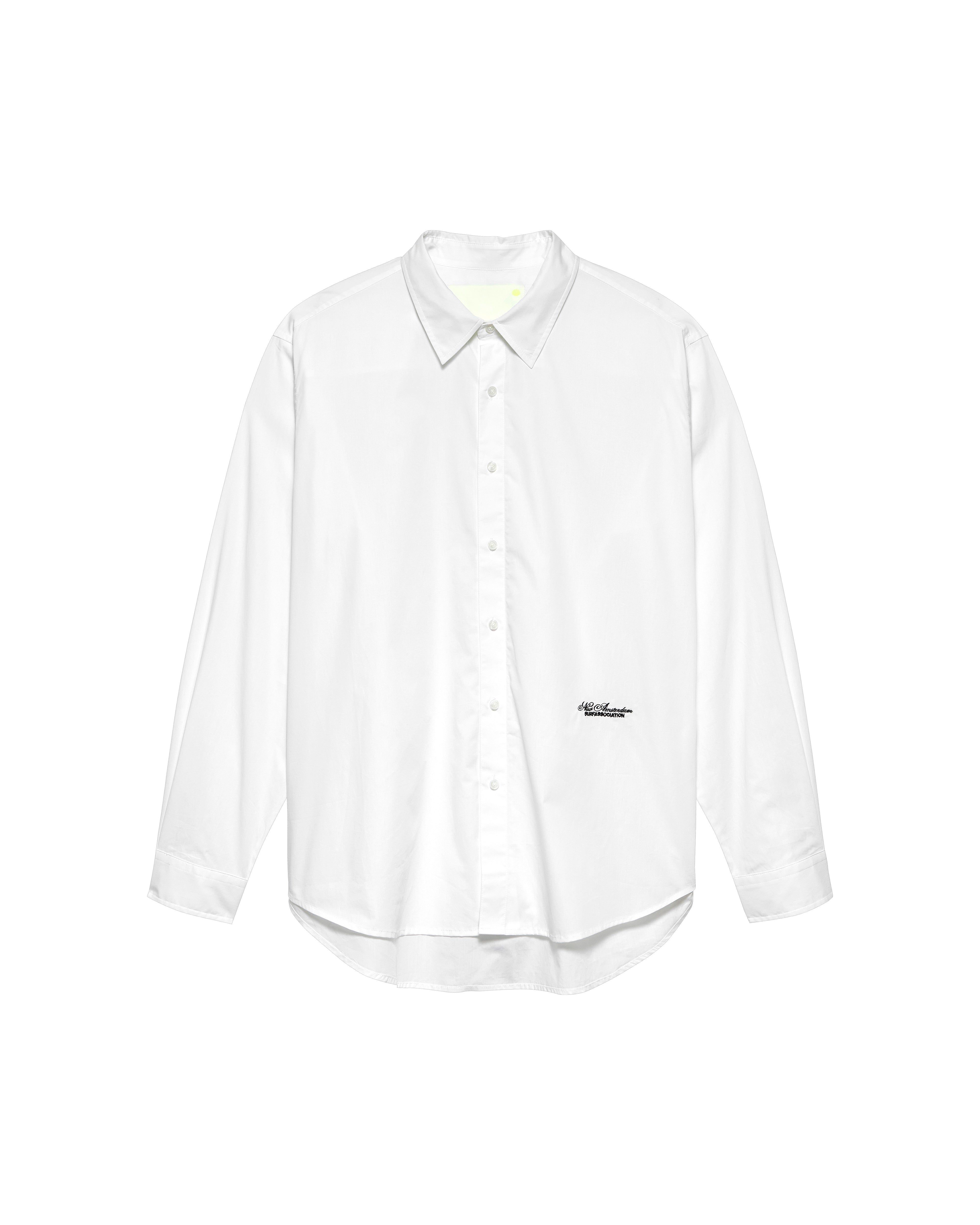 Low stockButton-up shirt crafted from lightweight cotton poplin in white, with a small contrast New Amsterdam text logo embroidered on the front. Cut for a regular fit with a hip-length silhouette.
