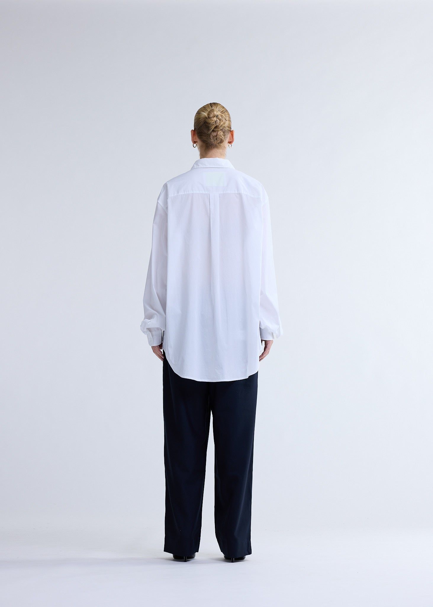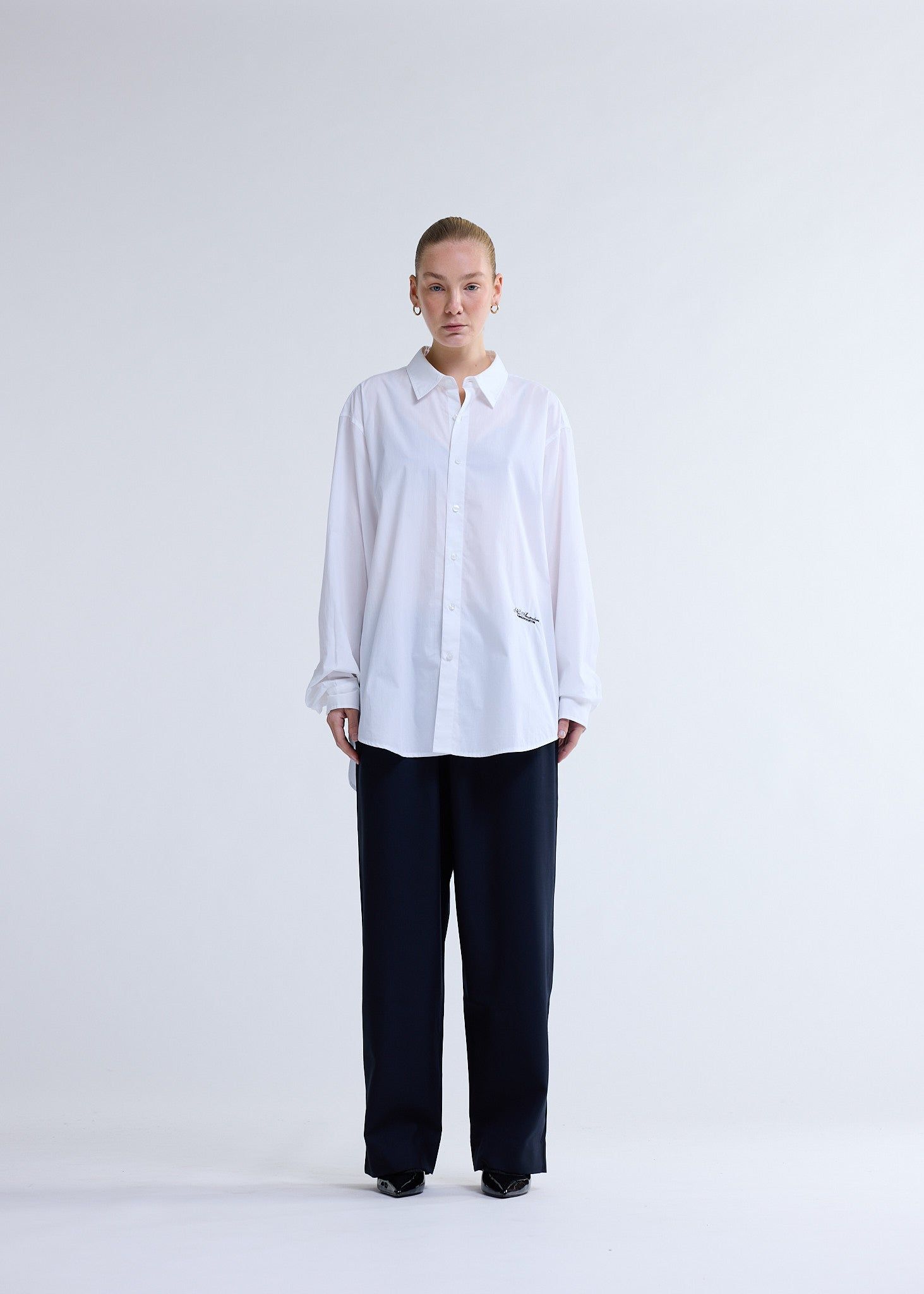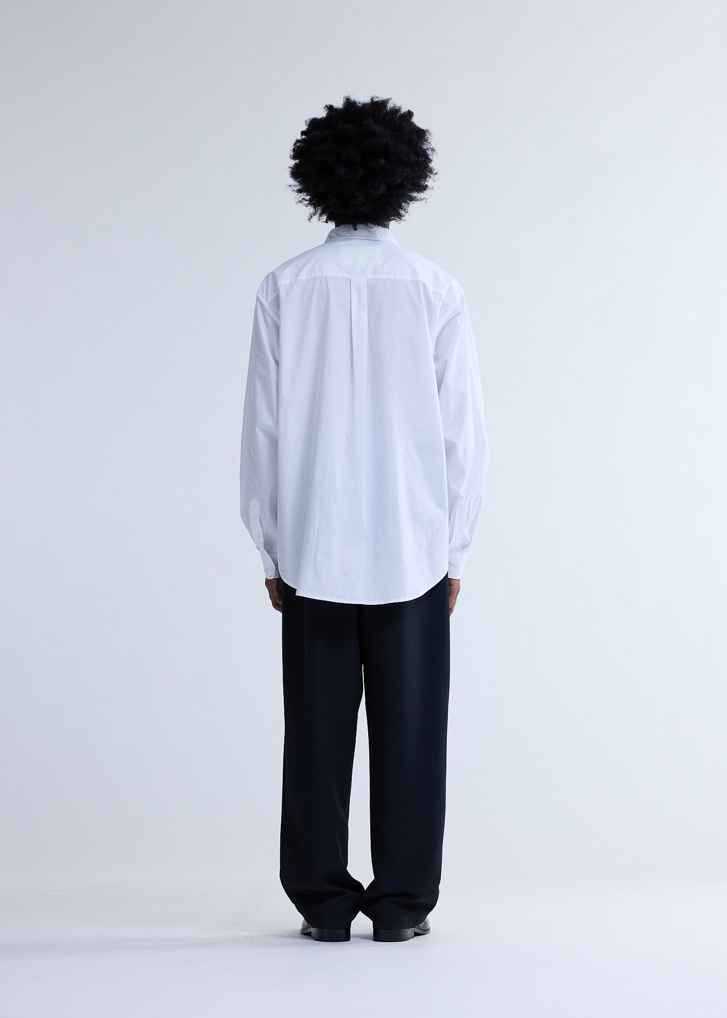 Low stockButton-up shirt crafted from lightweight cotton poplin in white, with a small contrast New Amsterdam text logo embroidered on the front. Cut for a regular fit with a hip-length silhouette.