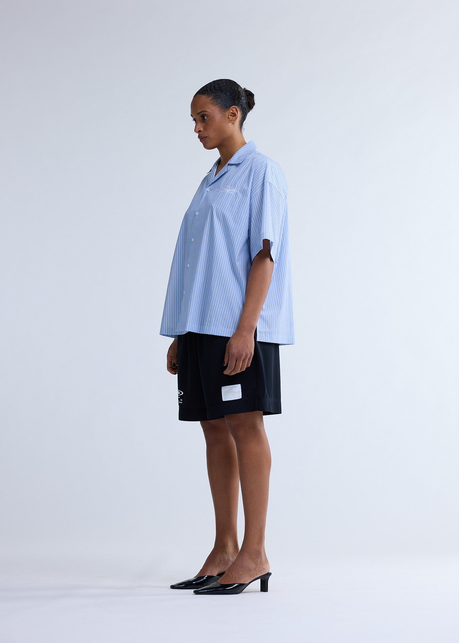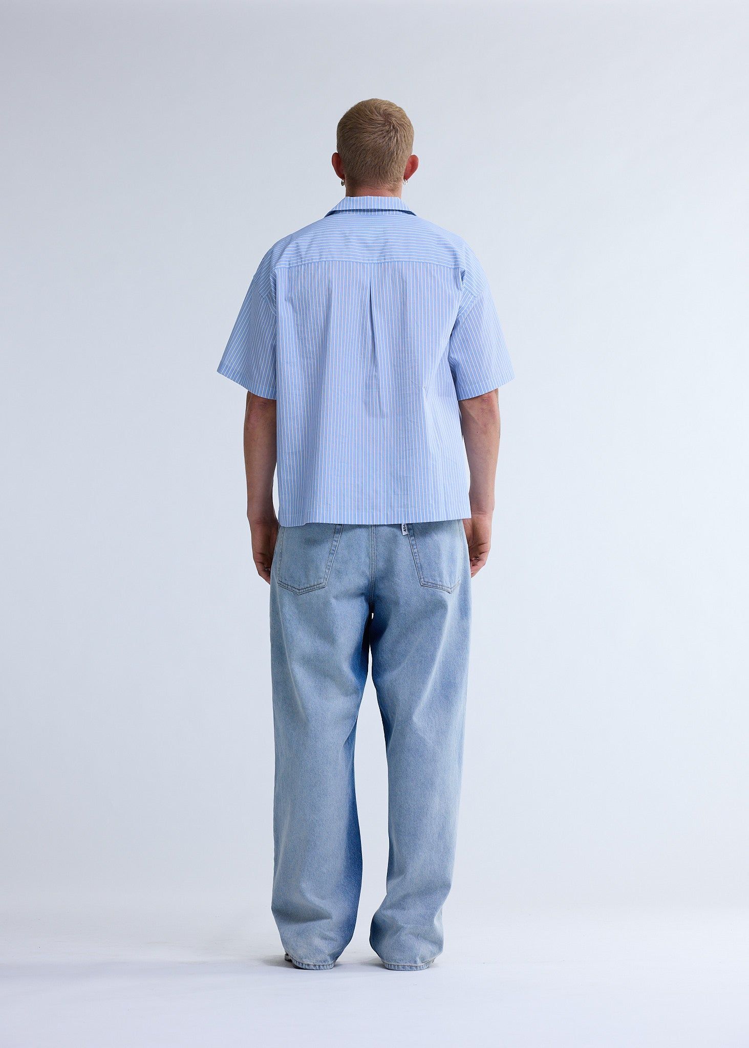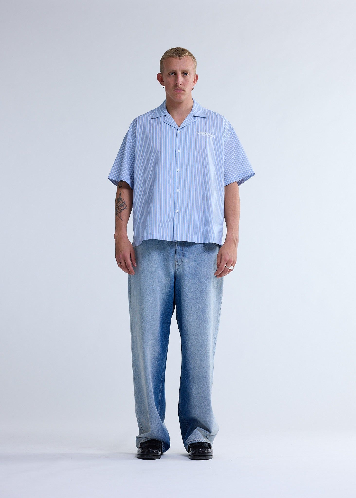 Low stockButton-up striped shirt cut to a relaxed unisex fit with dropped shoulders and a hip-length silhouette. Features a New Amsterdam seasonal logo embroidery on the chest. This shirt is made from 100% cotton fabric.