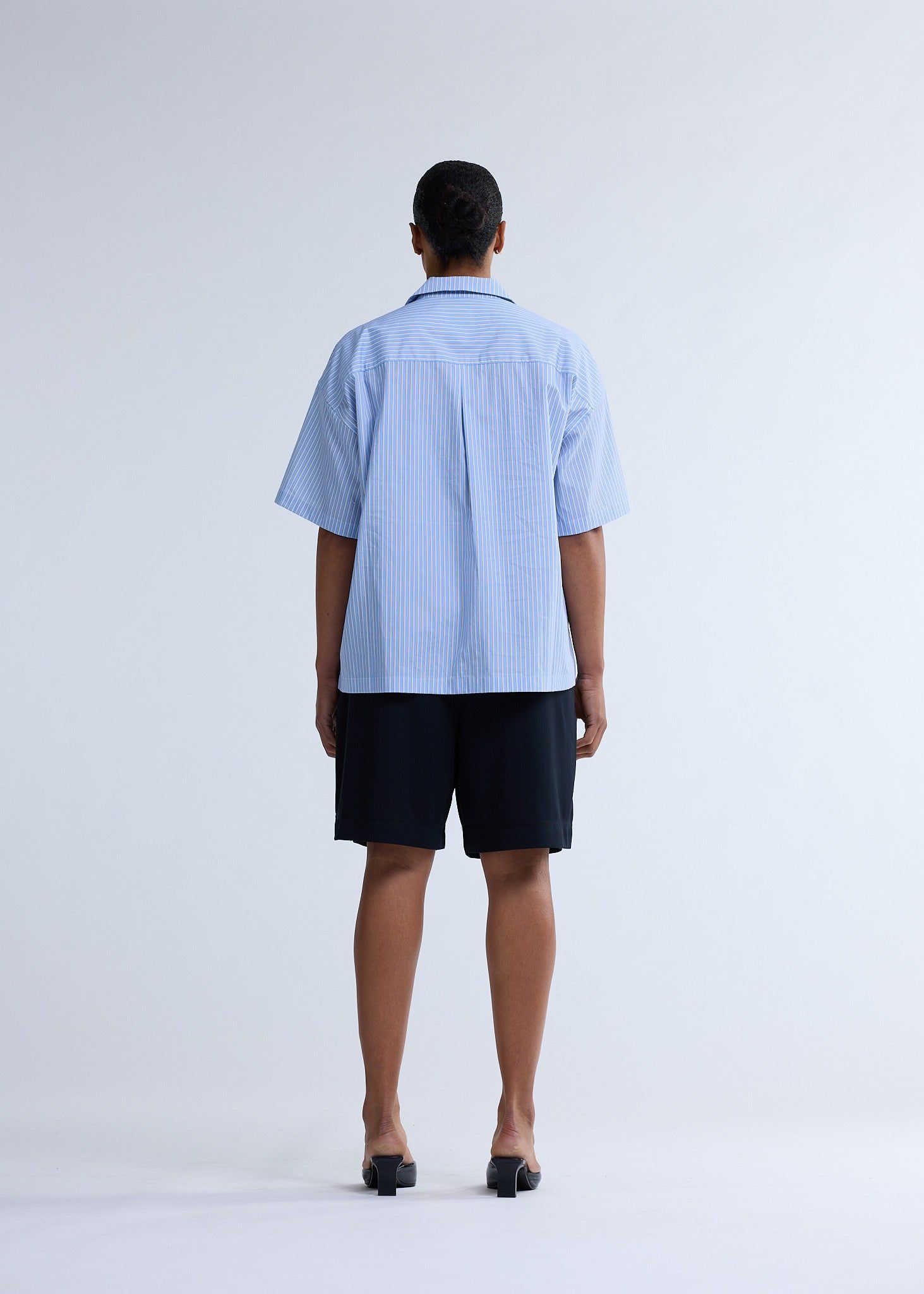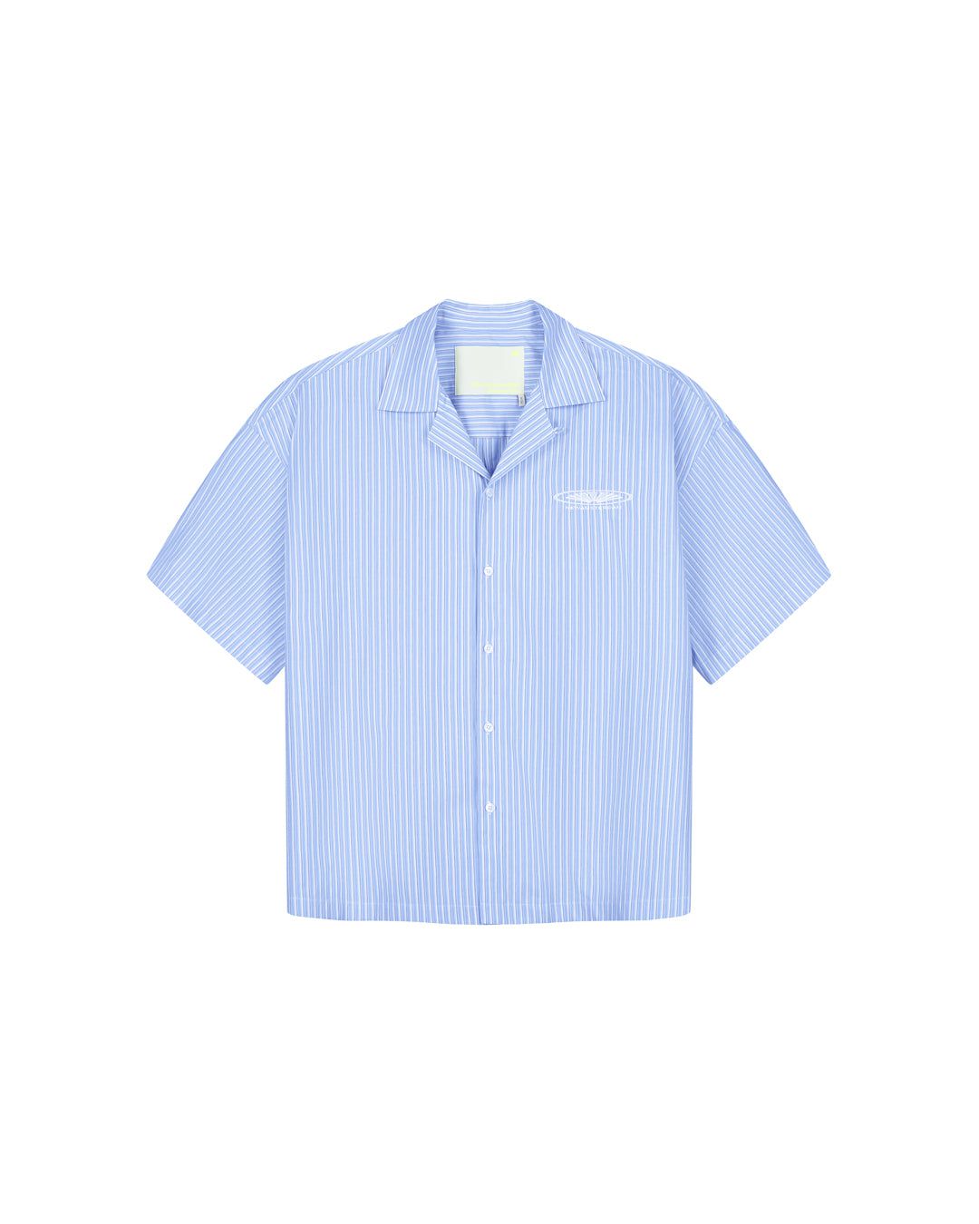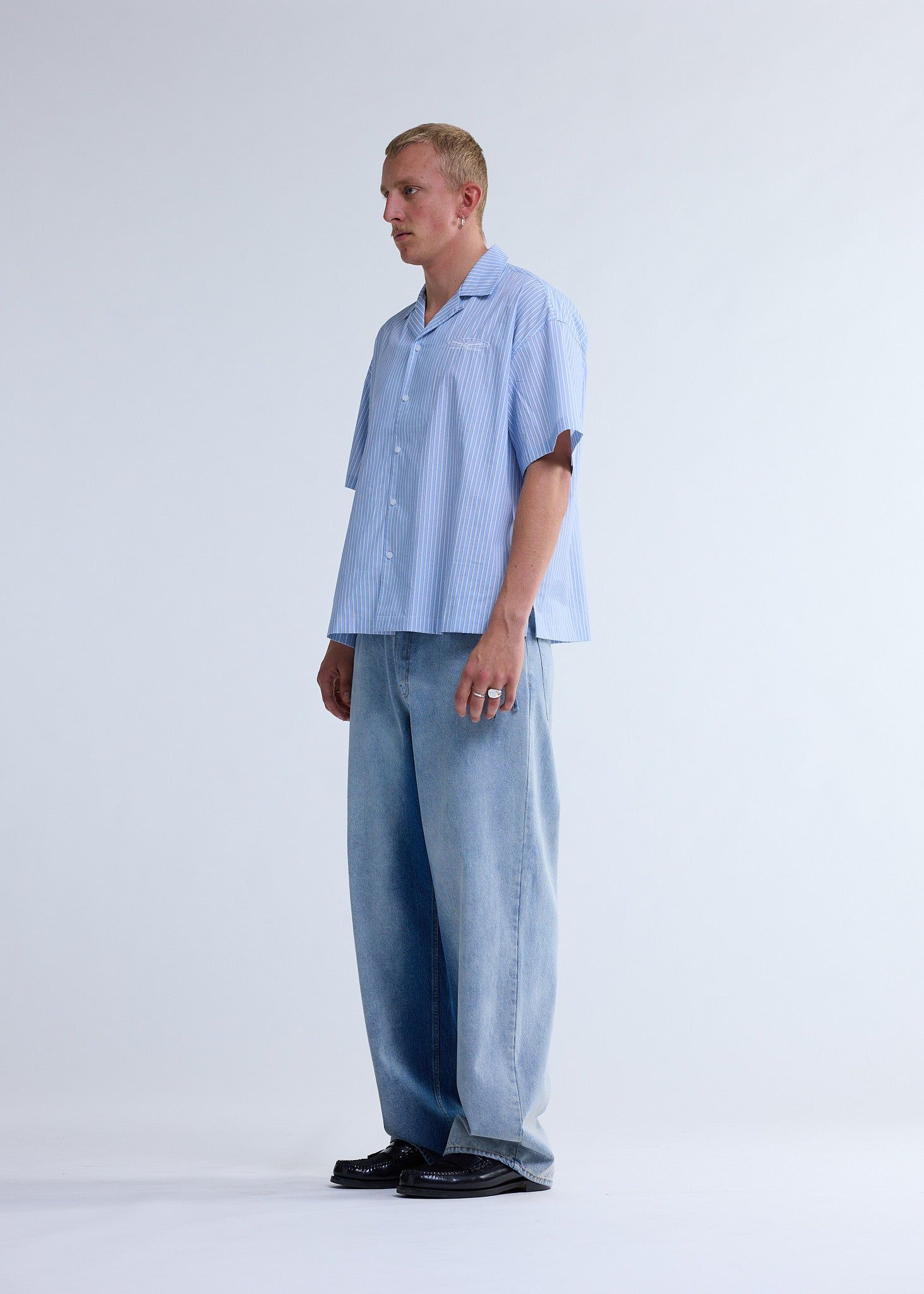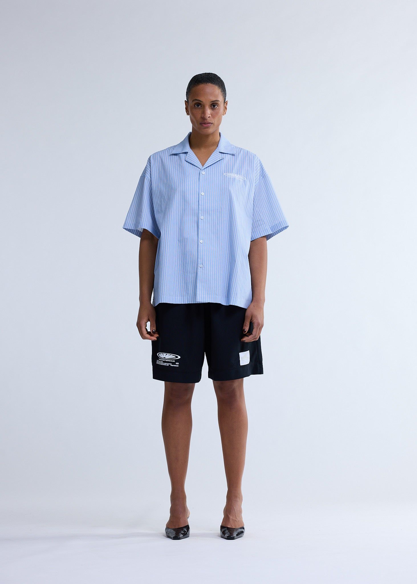 Low stockButton-up striped shirt cut to a relaxed unisex fit with dropped shoulders and a hip-length silhouette. Features a New Amsterdam seasonal logo embroidery on the chest. This shirt is made from 100% cotton fabric.