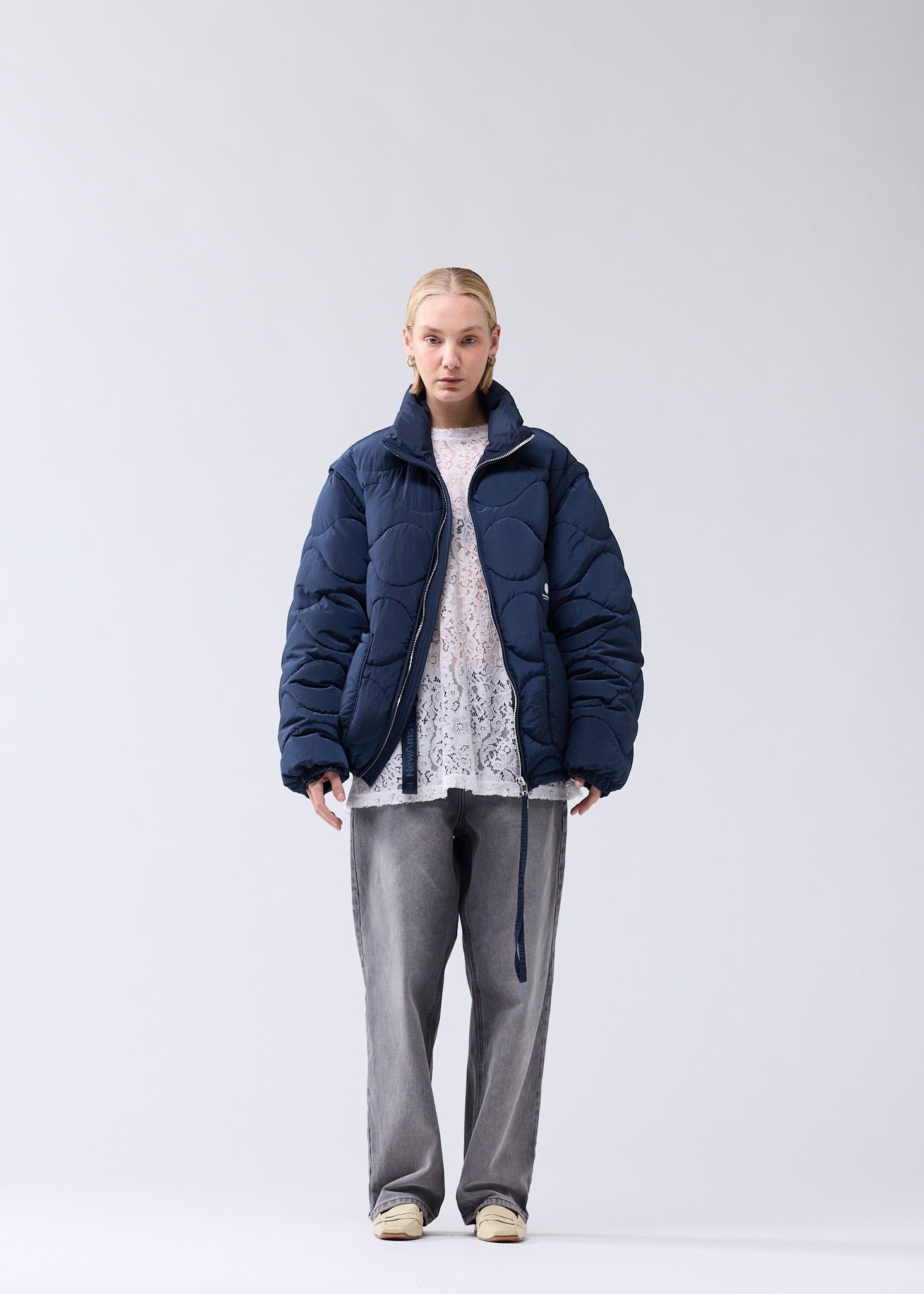 Designed with detachable sleeves, a metal double zipper, patch pockets, and branded cordstoppers, this jacket easily adapts from city wear to outdoor use. Branded front and back with the New Amsterdam logo, it’s a bold and functional statement jacket.