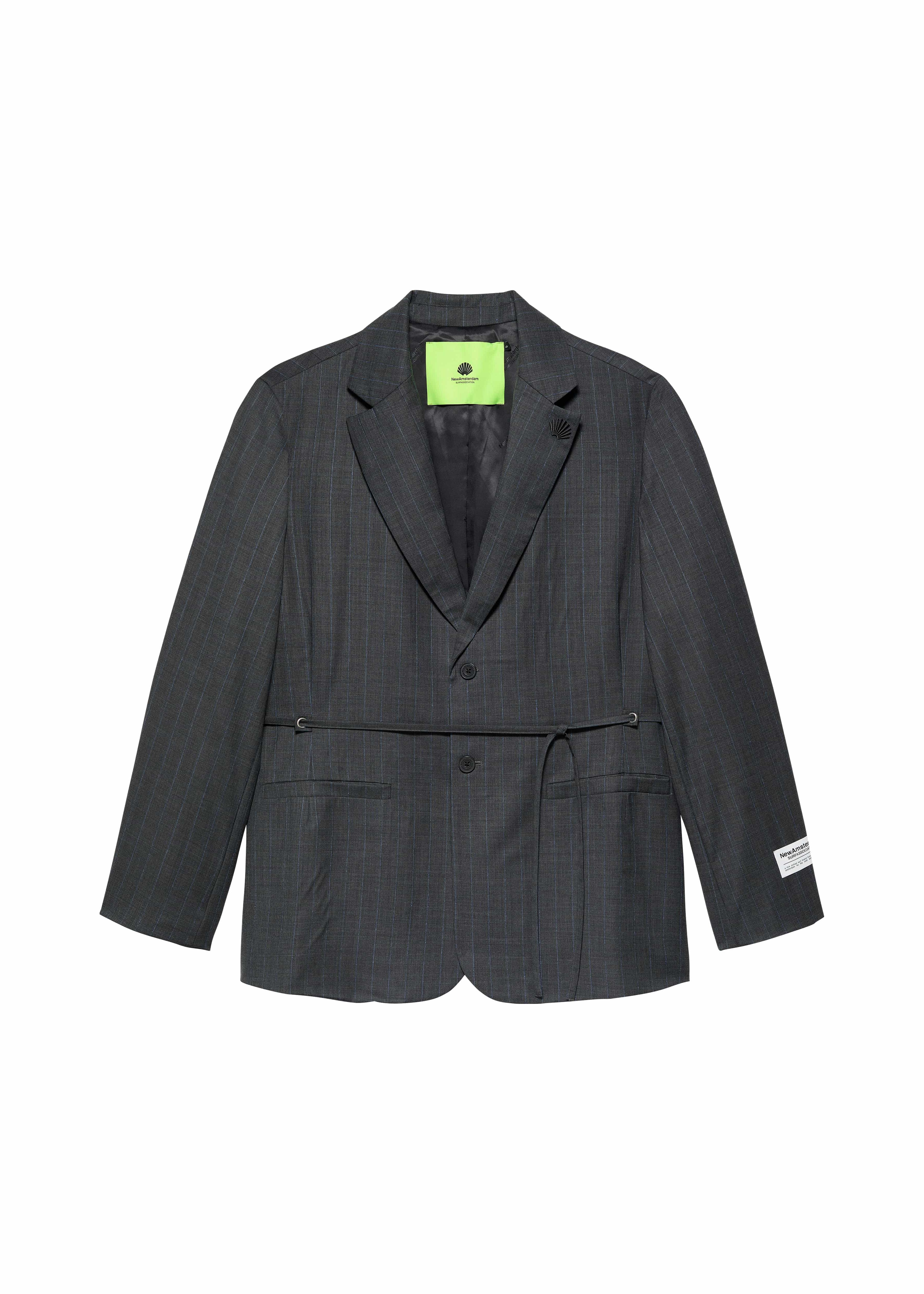 Low stockRelaxed fit suit jacket made from a pinstripe fabric. The jacket is lined with our branded black lining and is branded on the outside with our label on the left sleeve. It also has a tonal shell embroidery on the lapel. The waist is adjustable by a cord.