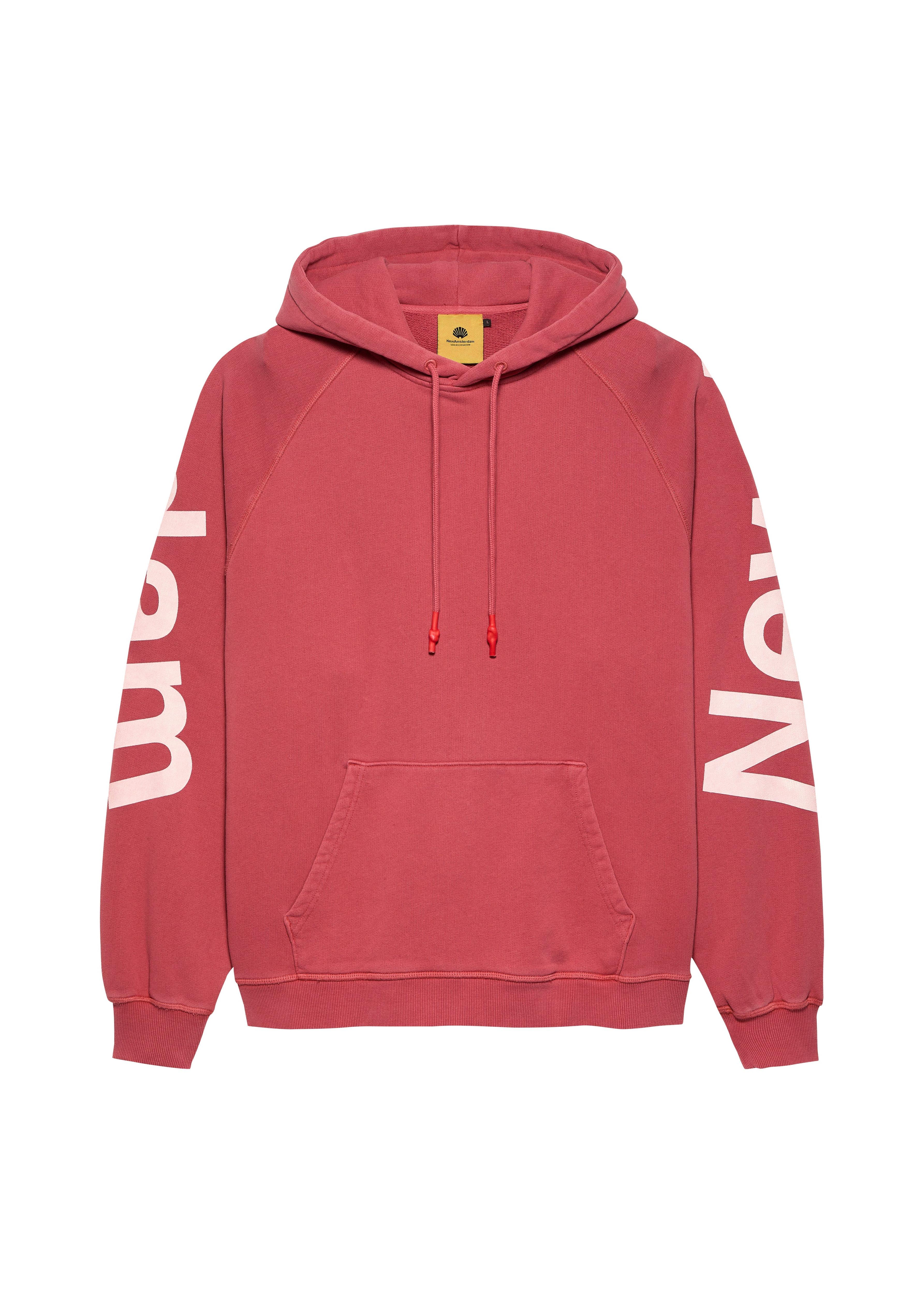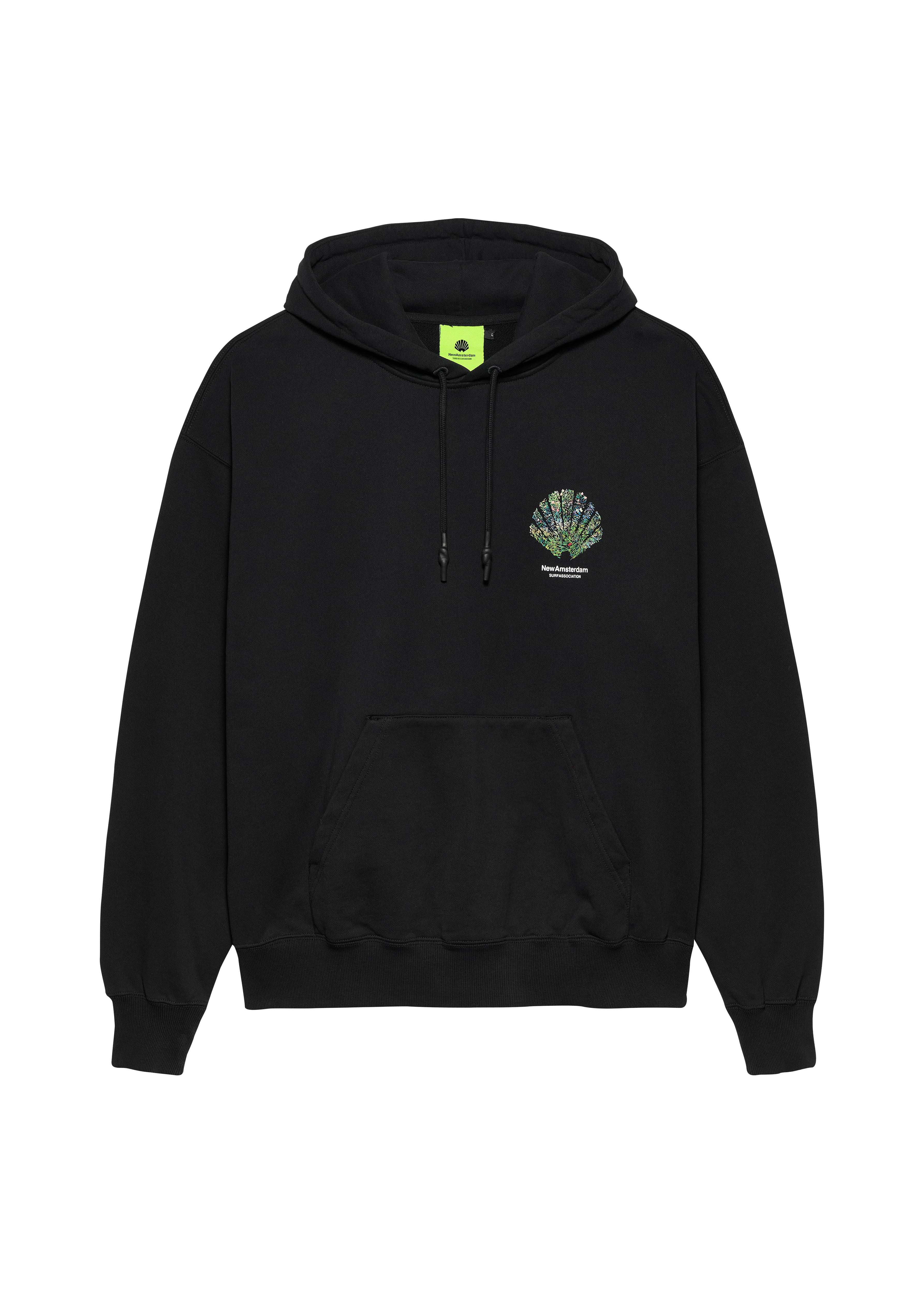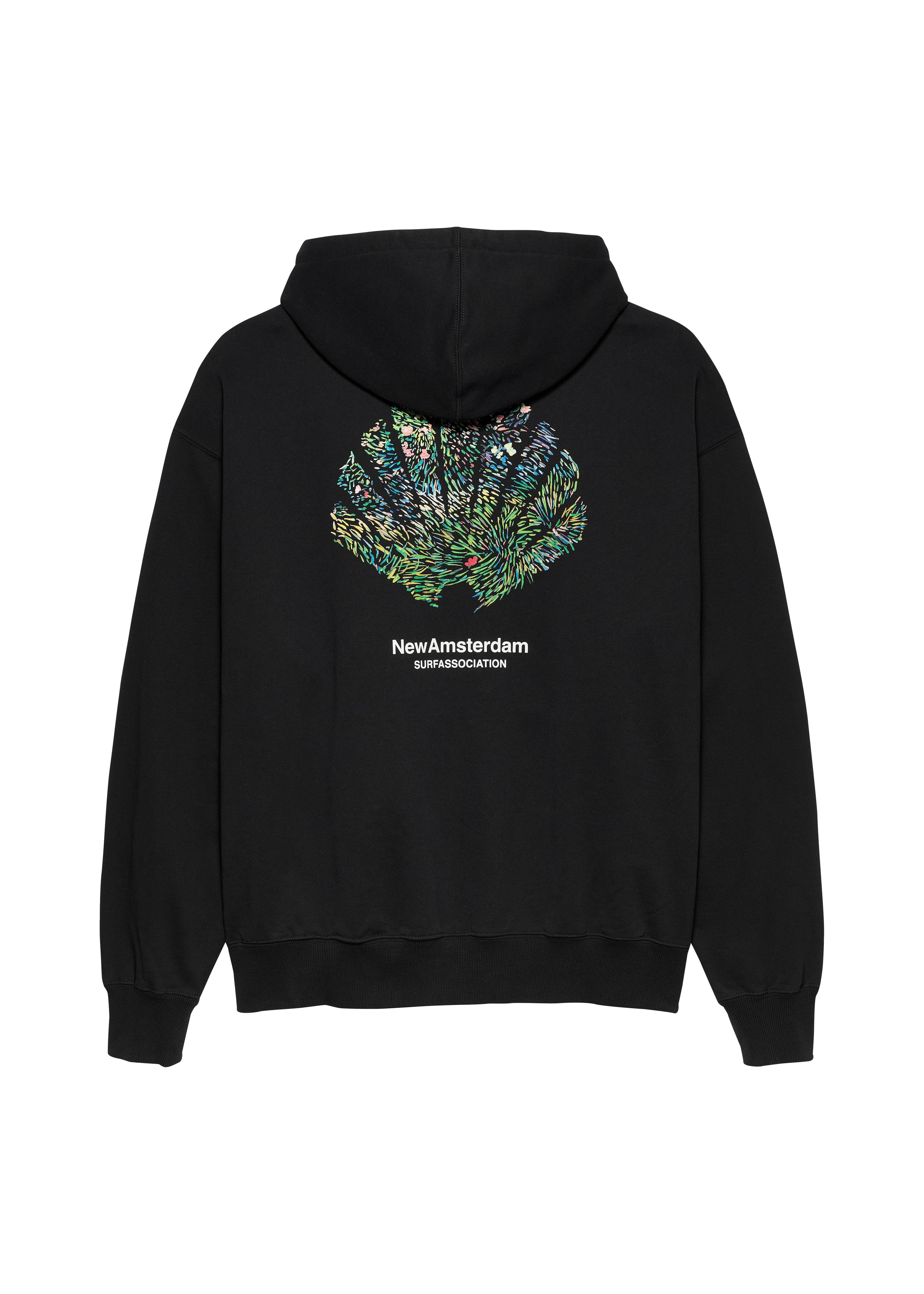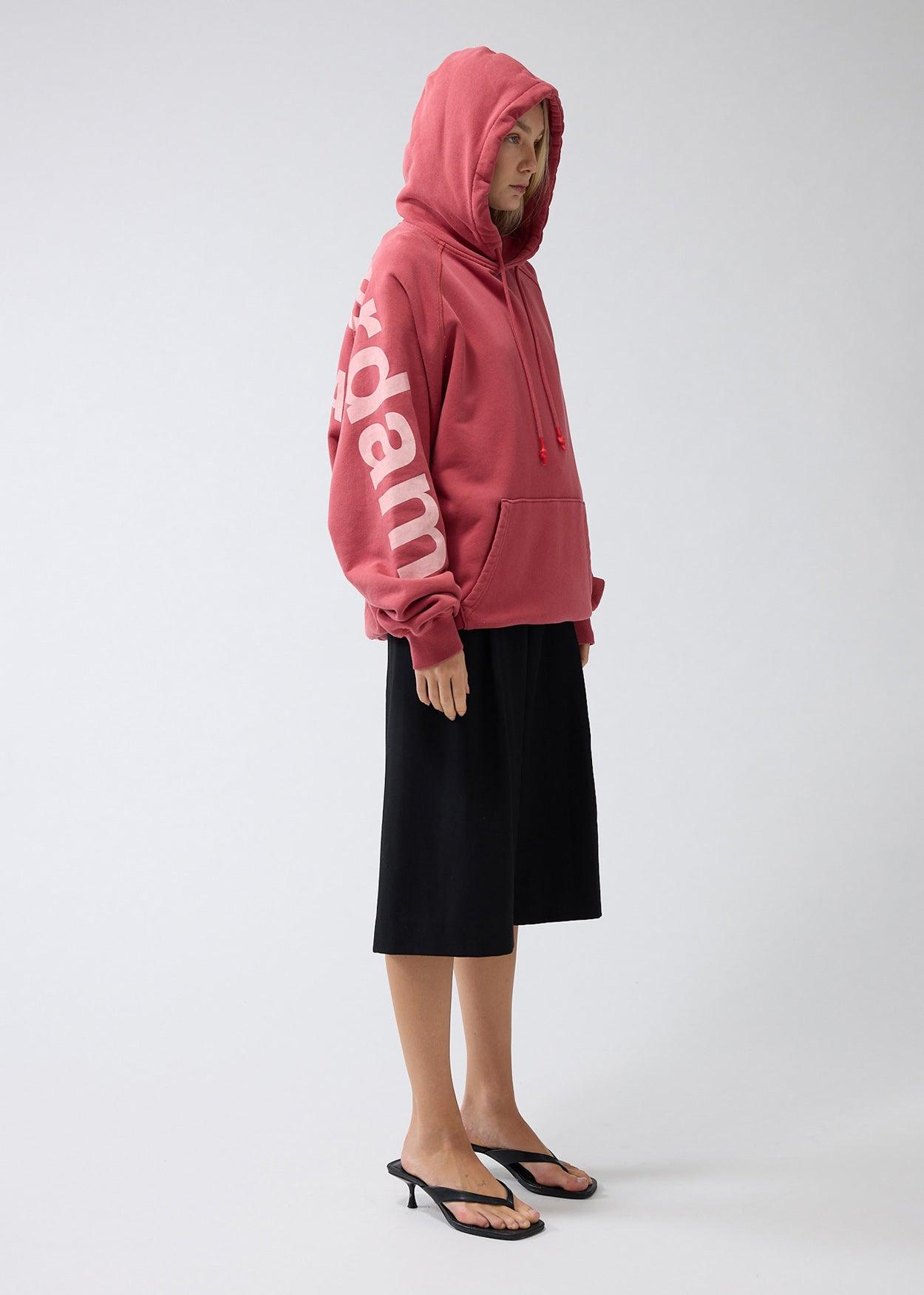 Tape yarn knitted hoodie features a seasonal jacquard logo on the back with ribbed cuffs. Cut to a relaxed fit and hip length.