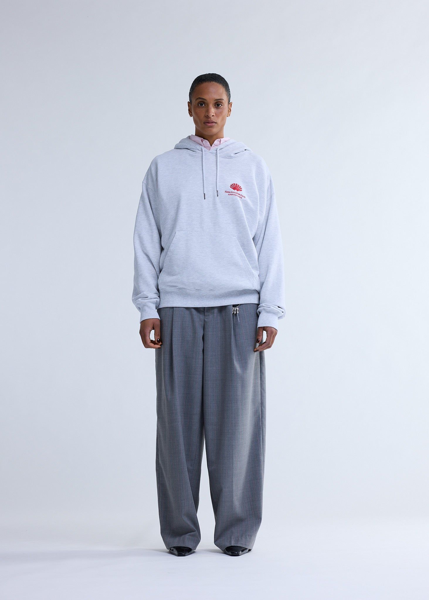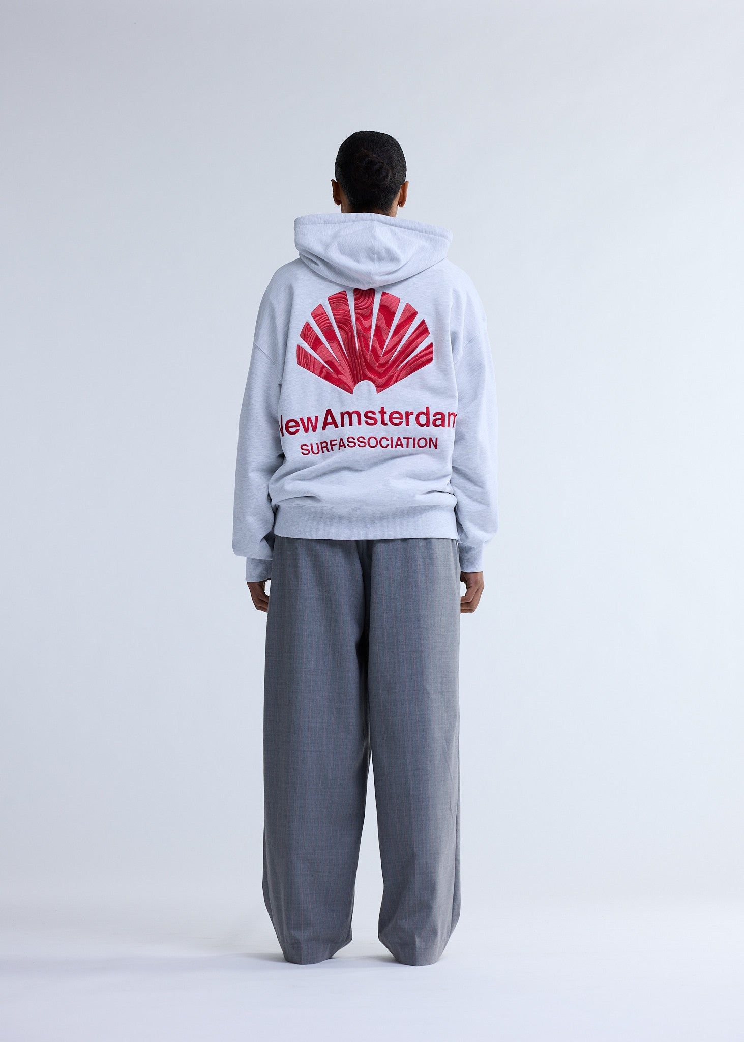 Hooded sweater, cut to a relaxed unisex fit. Detailed with a special New Amsterdam logo embroidery on the front and back, made using two different colored yarns and varied embroidery structures. This hoodie is made out of 100% heavyweight cotton.