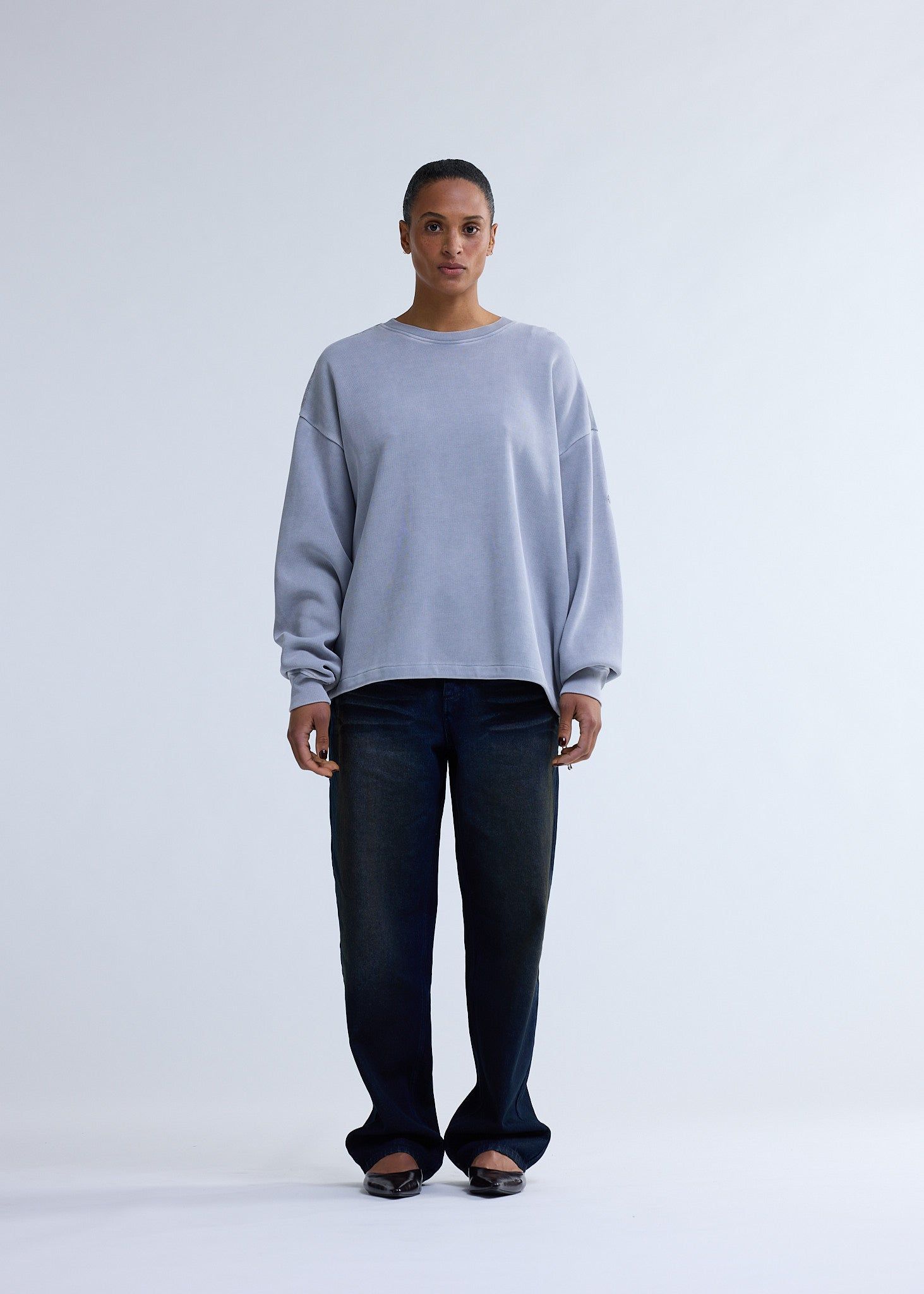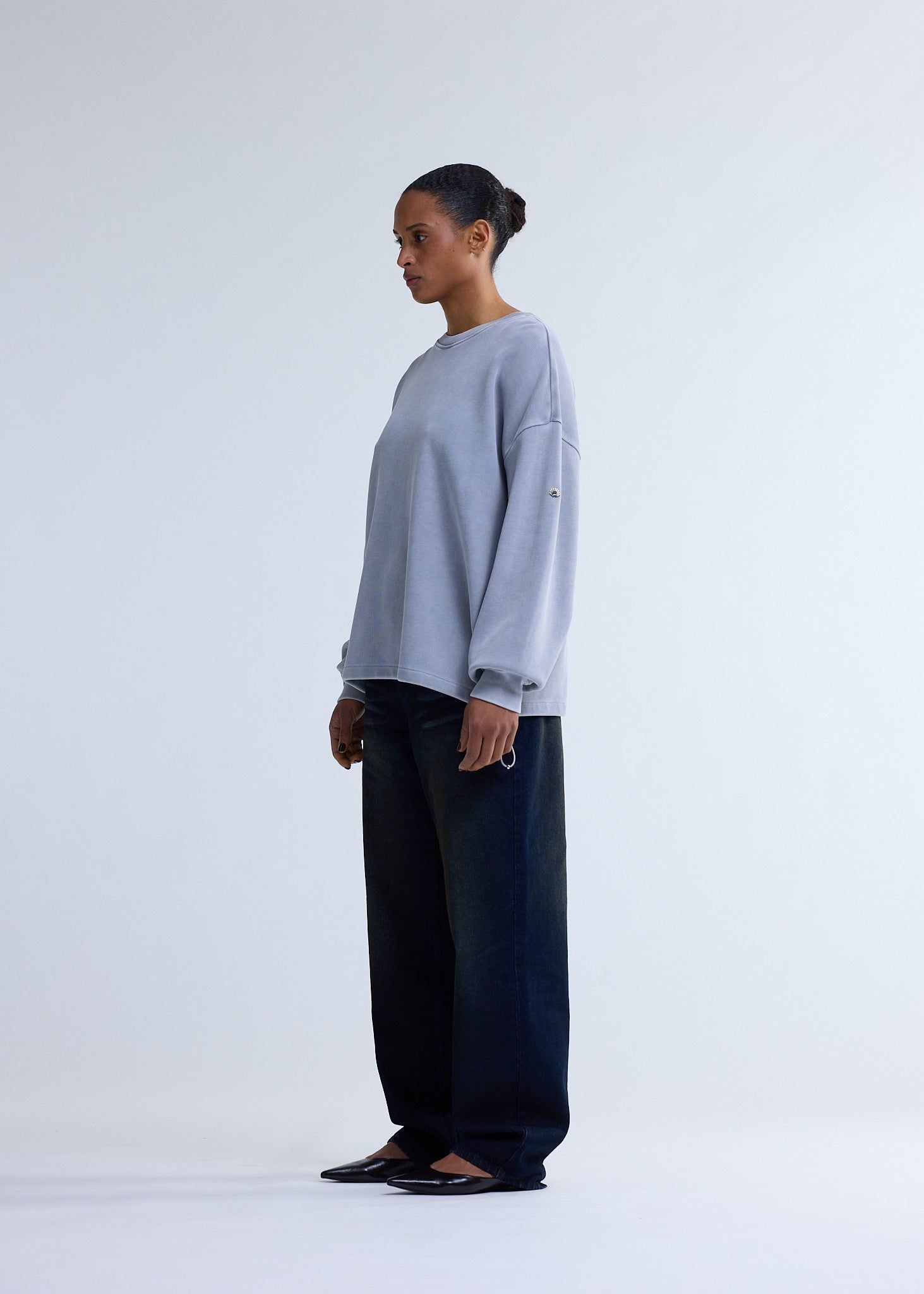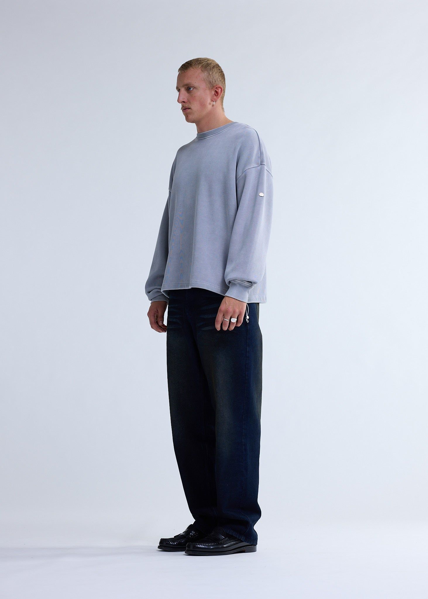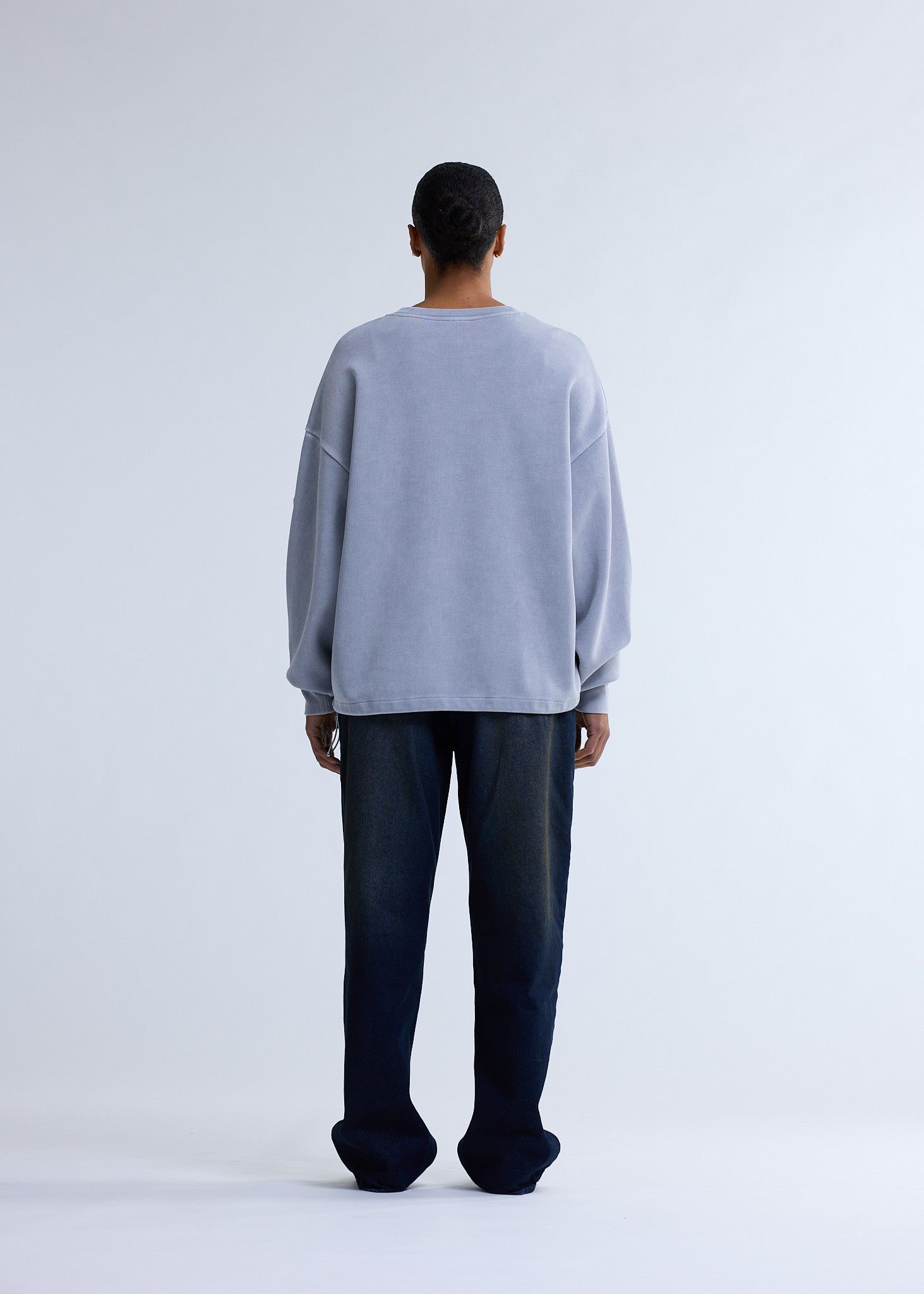Low stockCrewneck cut to an oversized unisex fit. This crewneck is made of heavyweight ribbed cotton with a snow wash finish for a sun faded look. Detailed with mini metal New Amsterdam logo placed on arm.