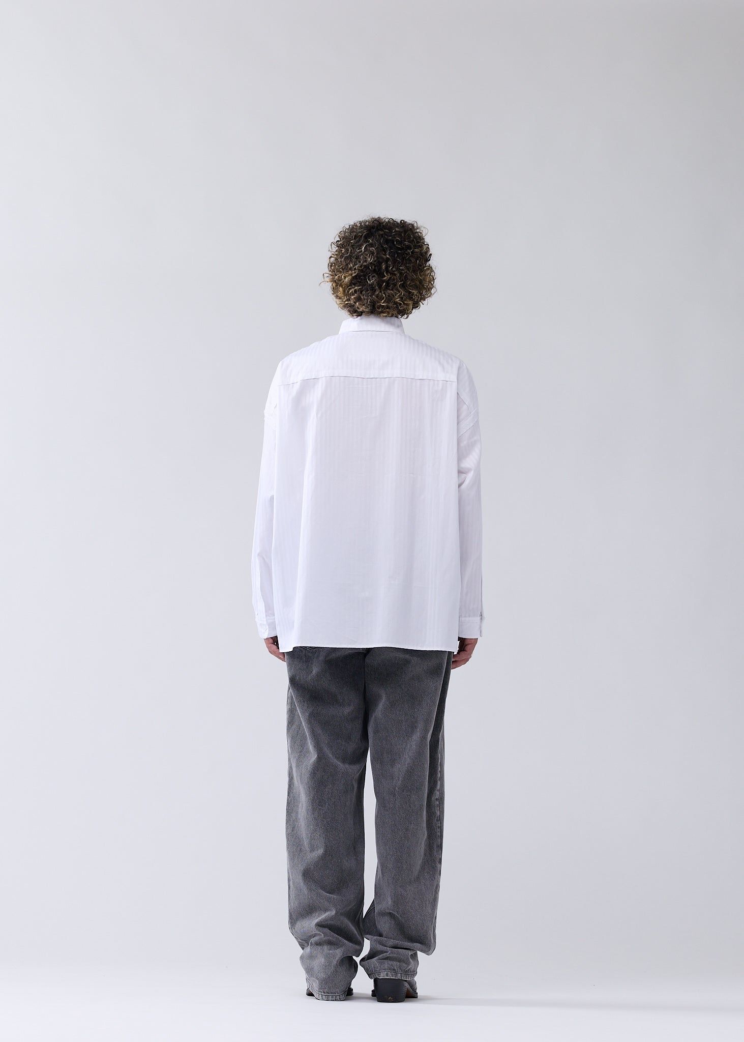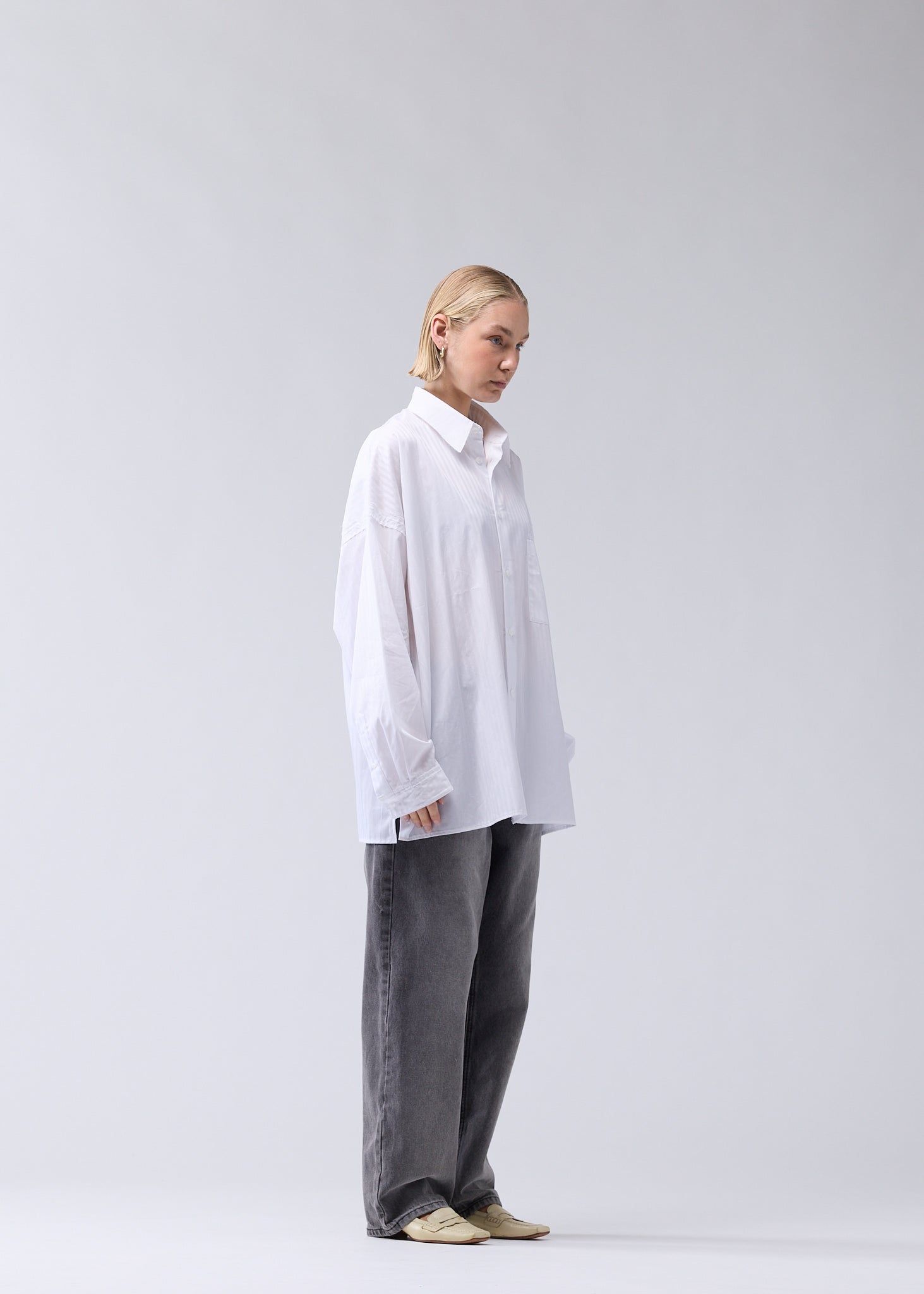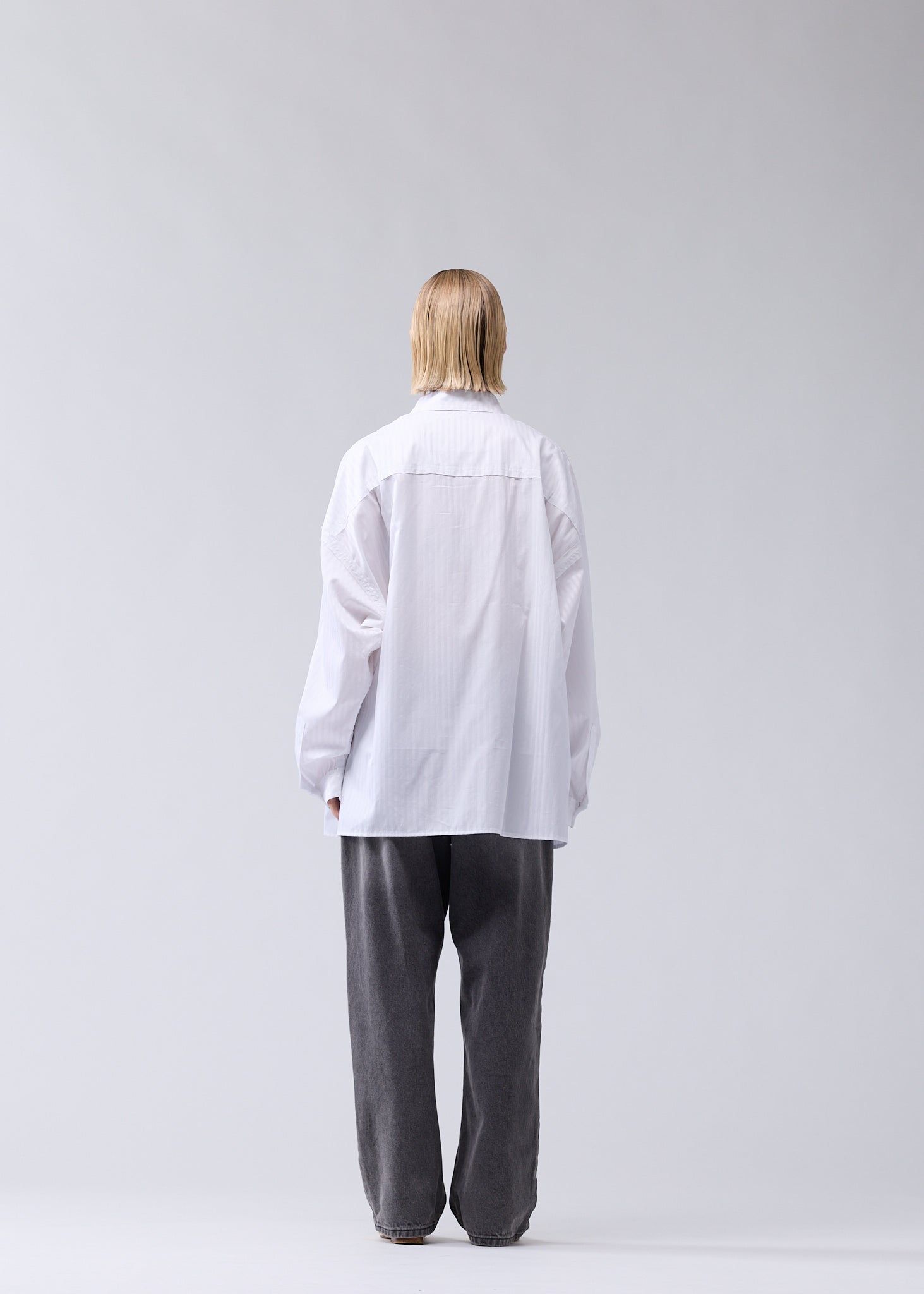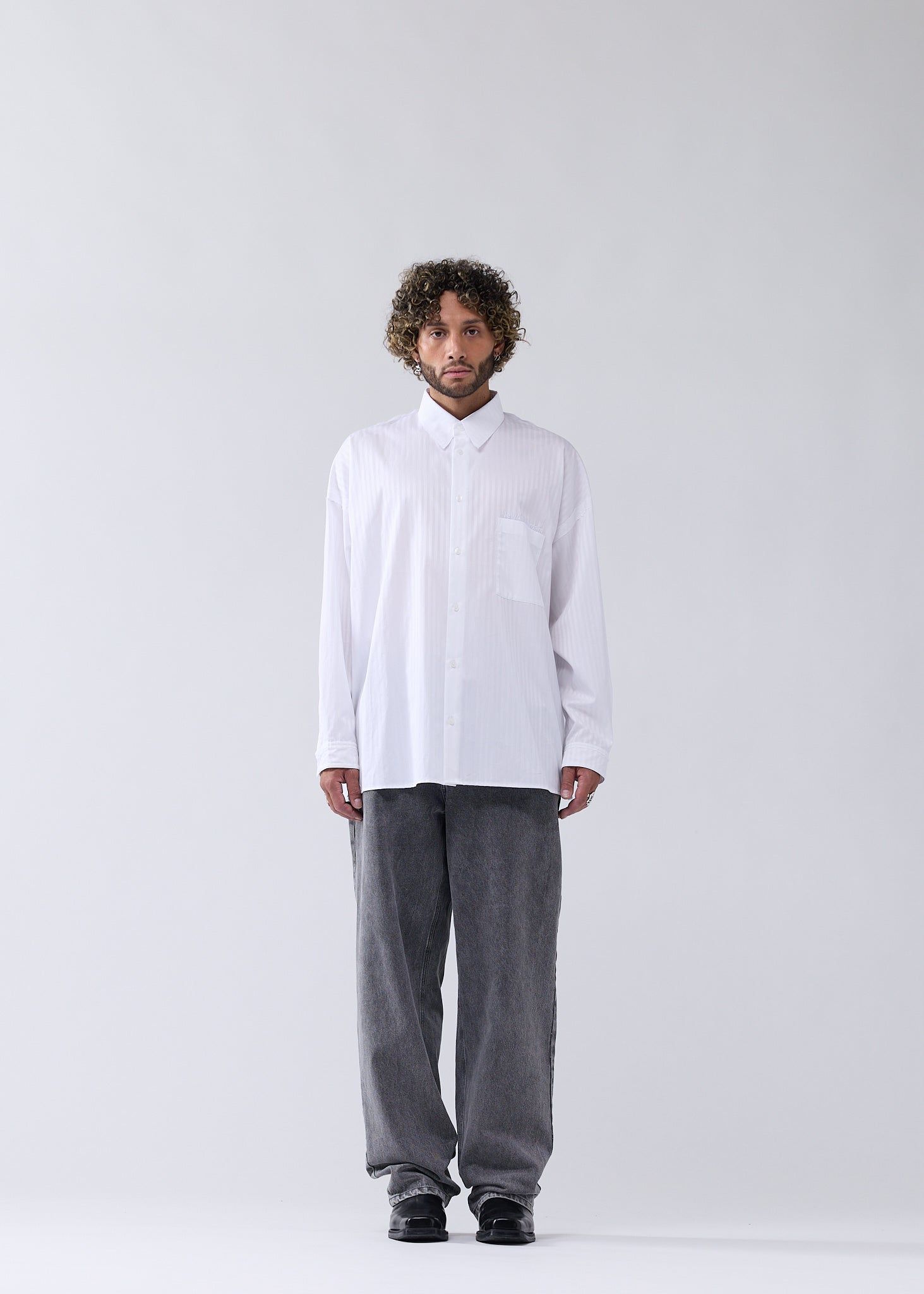 30% offLow stockButton-up shirt crafted from a cotton jacquard stripe, designed in a oversized fit that falls below the hip. Features a chest pocket with subtle embroidery detail and is finished with raw edge seams at the shoulder, armhole and cuffs.